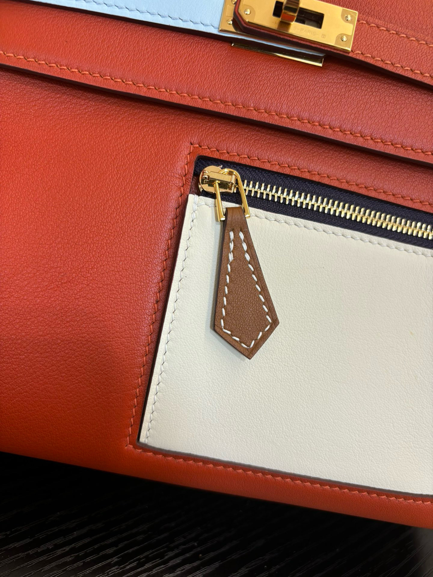 Kelly Colormatic. Authentic quality luxury bag crafted in genuine leather comes with authenticity card, dust bag and gift bag. Hand-crafted from ultra-smooth Swift leather and finished with radiant gold hardware, this exceptional limited-edition masterpiece brings a fresh, artistic twist to the iconic Kelly silhouette. Its cleverly designed front pocket opens wide with a single gusset for effortless access, while the rear flap pocket keeps your daily essentials—especially your most-used cards—right at your fingertips. The asymmetric yet perfectly balanced colour combination highlights the haute craftsmanship Hermès is celebrated for, turning every stitch into a statement. A collector’s dream and a style enthusiast’s delight, the Kelly Colormatic is sophistication with a spark—functional, vibrant, and unmistakably *rmès.