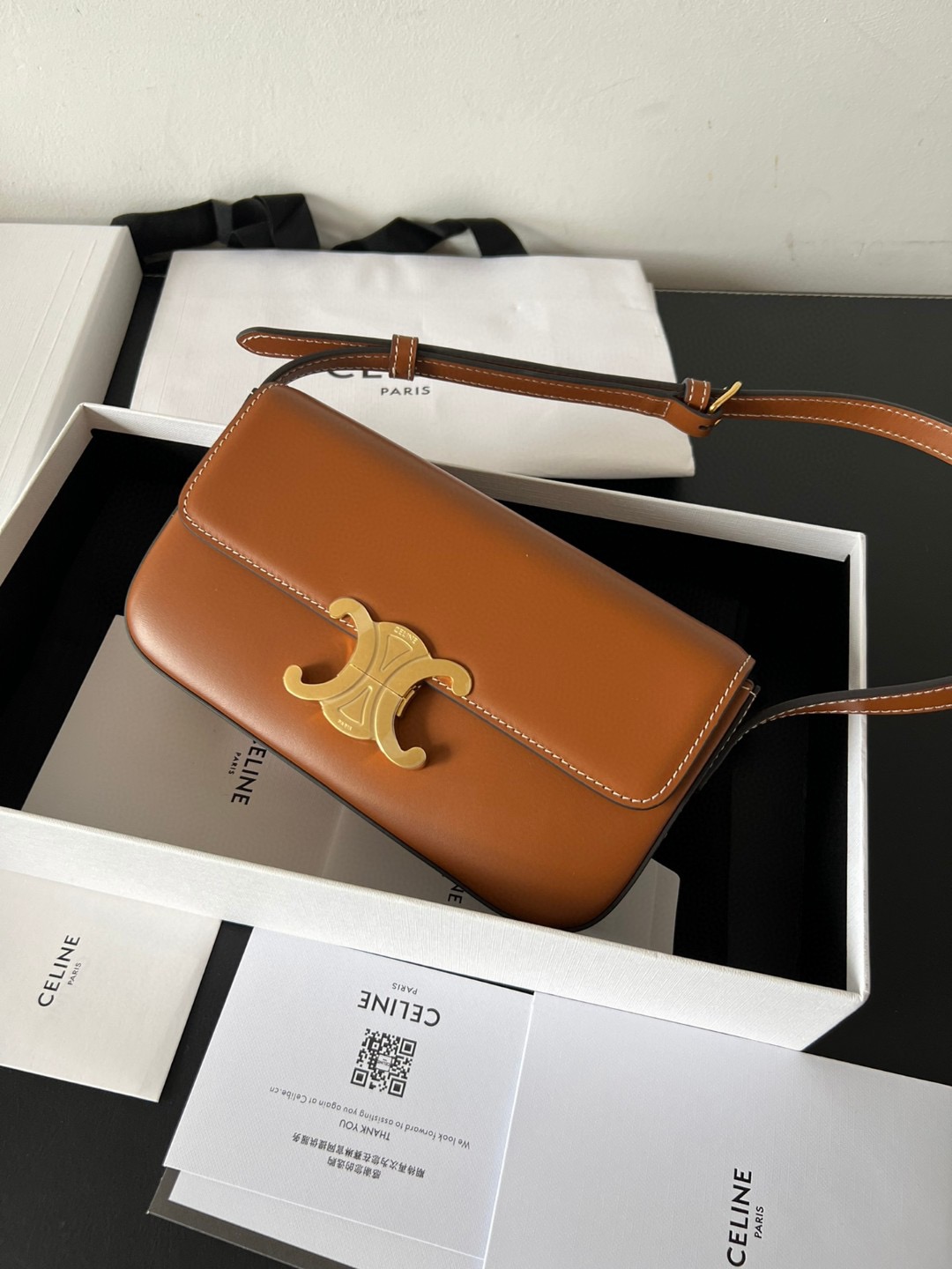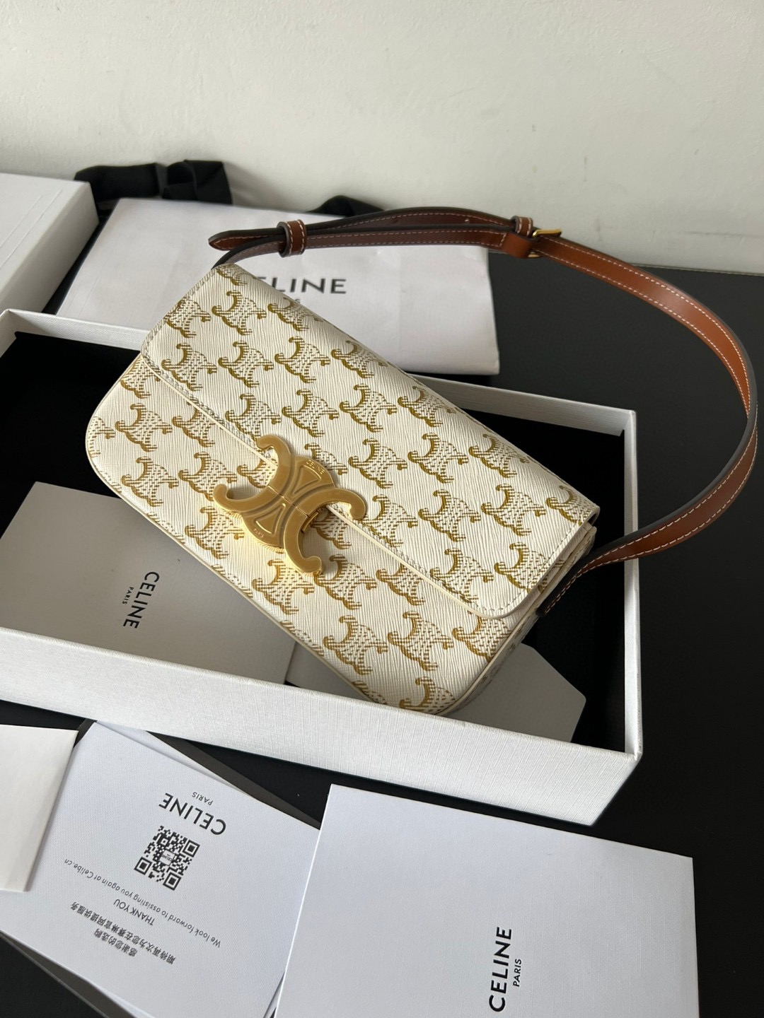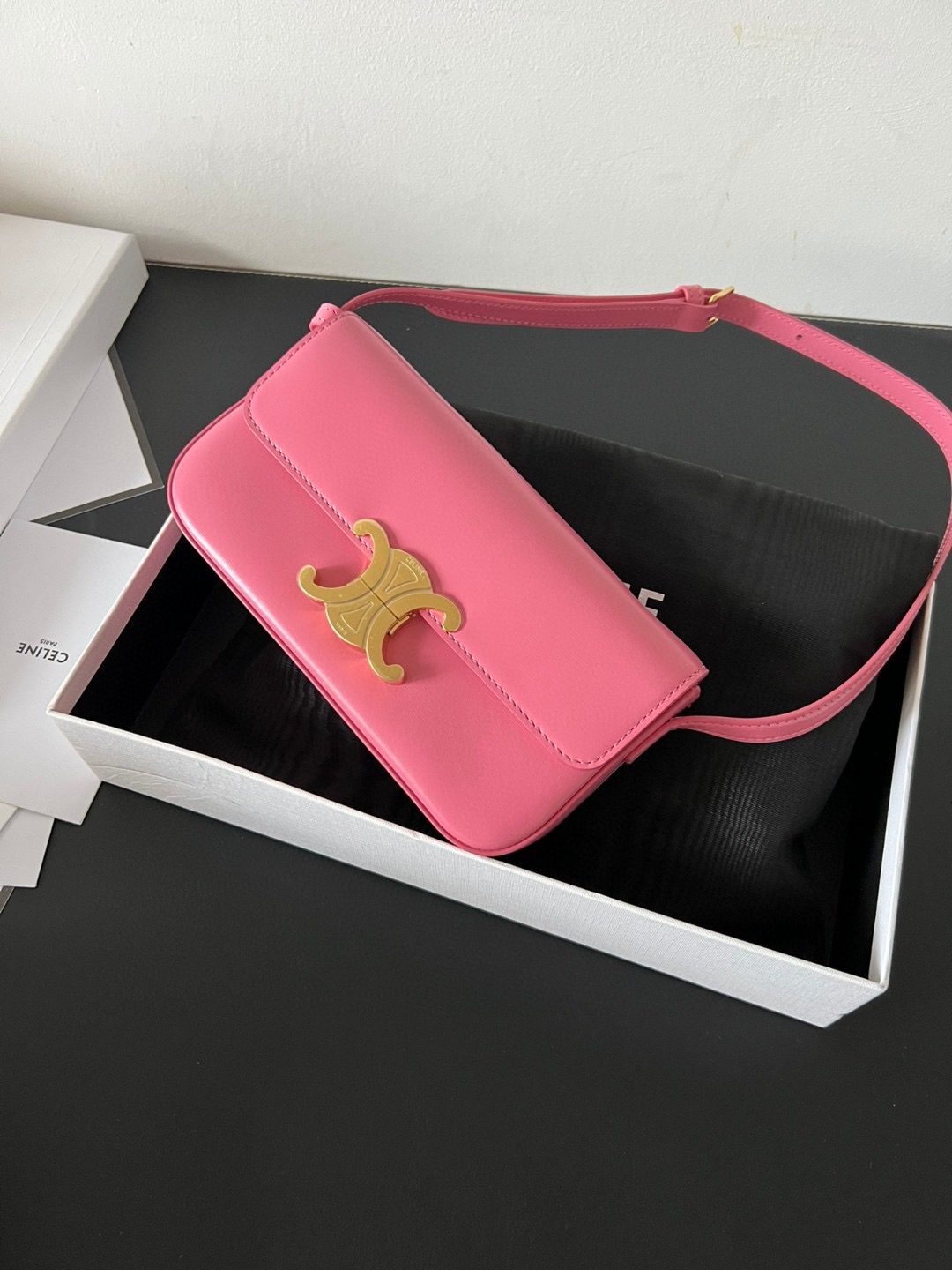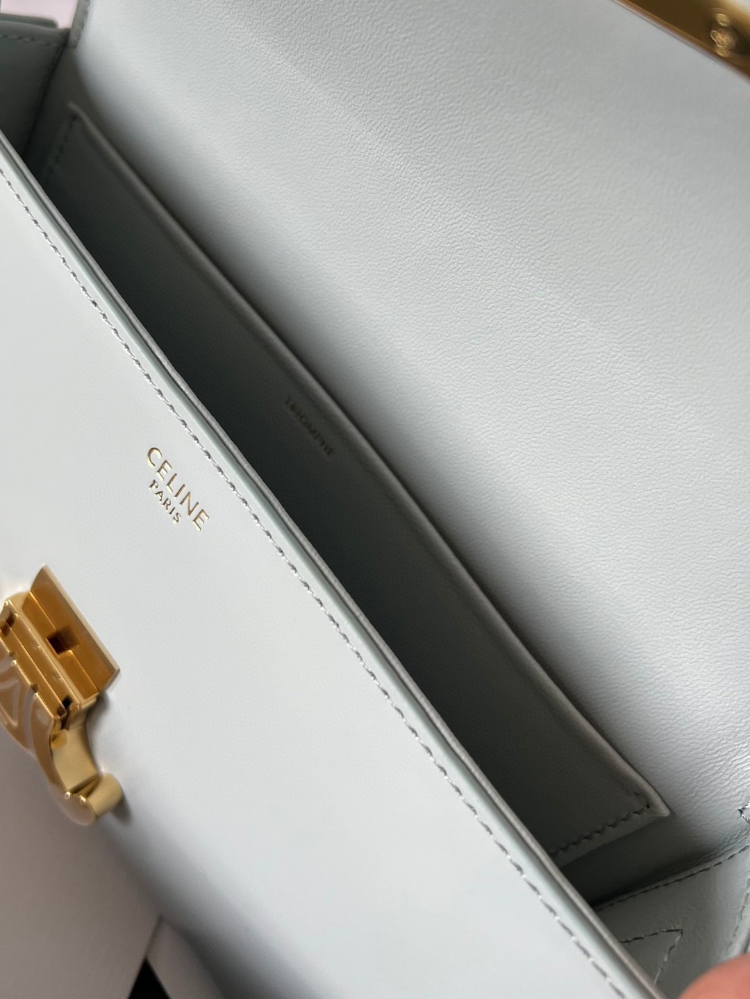 The bag boasts a beautifully minimalist design, with the spotlight shining on its exquisite leather craftsmanship. Its center is adorned with the elegant Triomphe Metallic Closure in gleaming gold hardware, where the iconic double C symbolizes Celine’s timeless style. Meticulously crafted from durable and robust calfskin leather, this versatile bag effortlessly transitions from special occasions to everyday wear, making it a chic and functional choice for any setting, including the workplace.