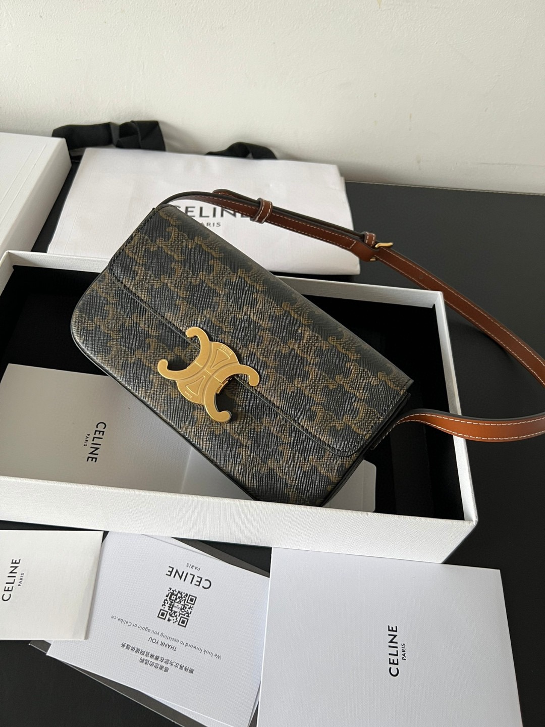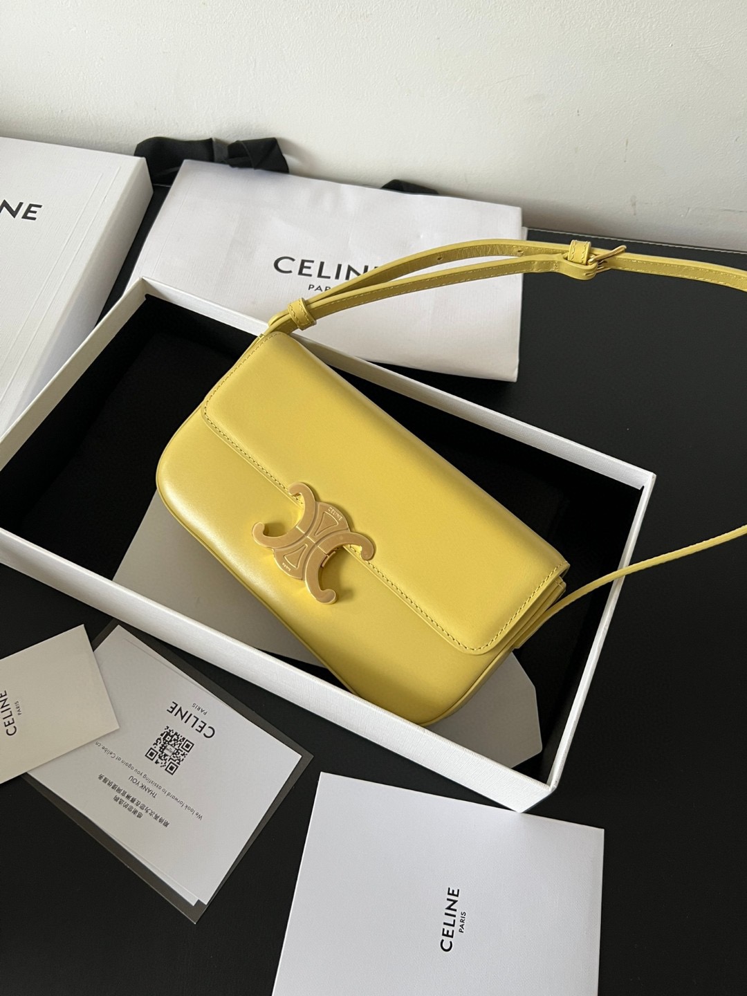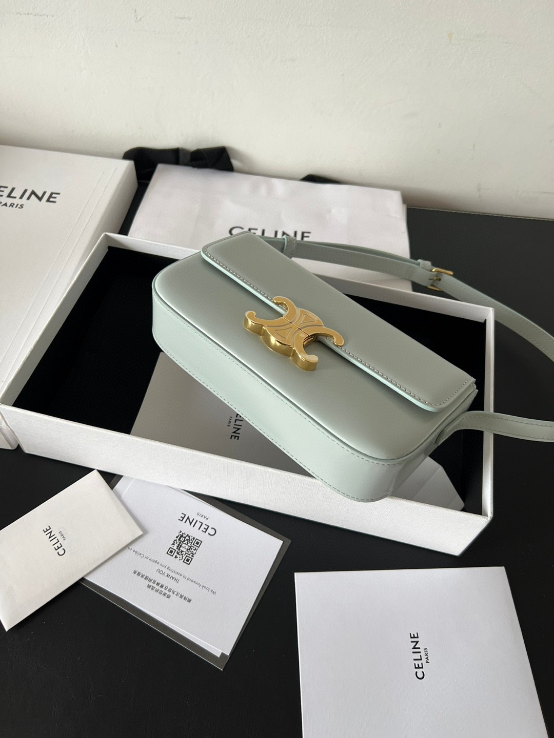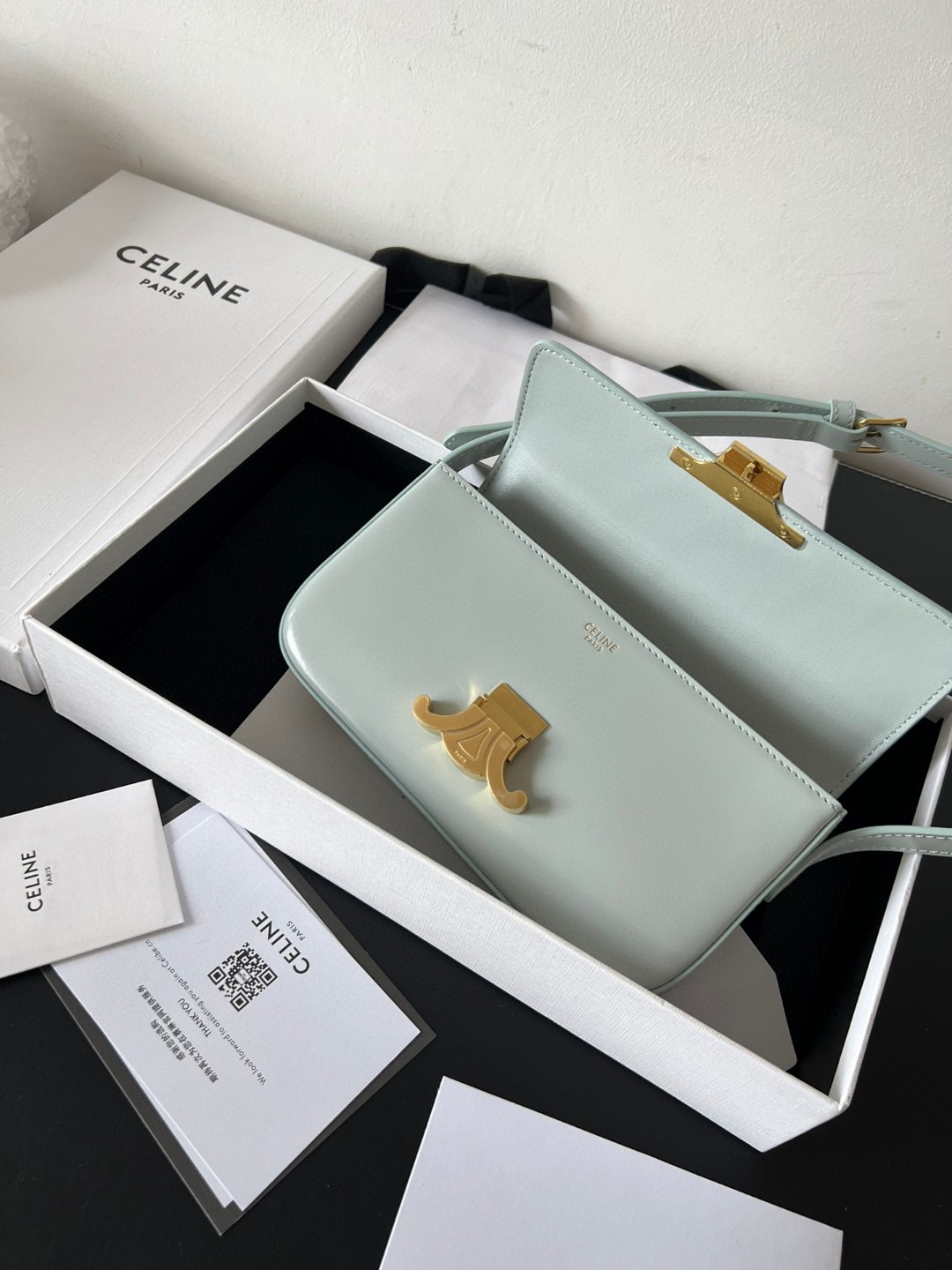 The bag boasts a beautifully minimalist design, with the spotlight shining on its exquisite leather craftsmanship. Its center is adorned with the elegant Triomphe Metallic Closure in gleaming gold hardware, where the iconic double C symbolizes Celine’s timeless style. Meticulously crafted from durable and robust calfskin leather, this versatile bag effortlessly transitions from special occasions to everyday wear, making it a chic and functional choice for any setting, including the workplace.