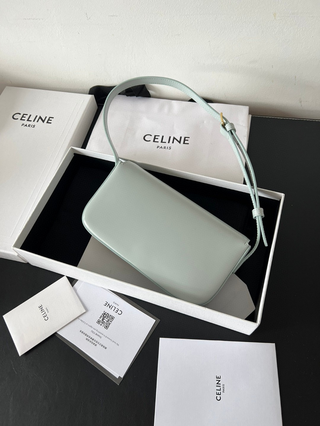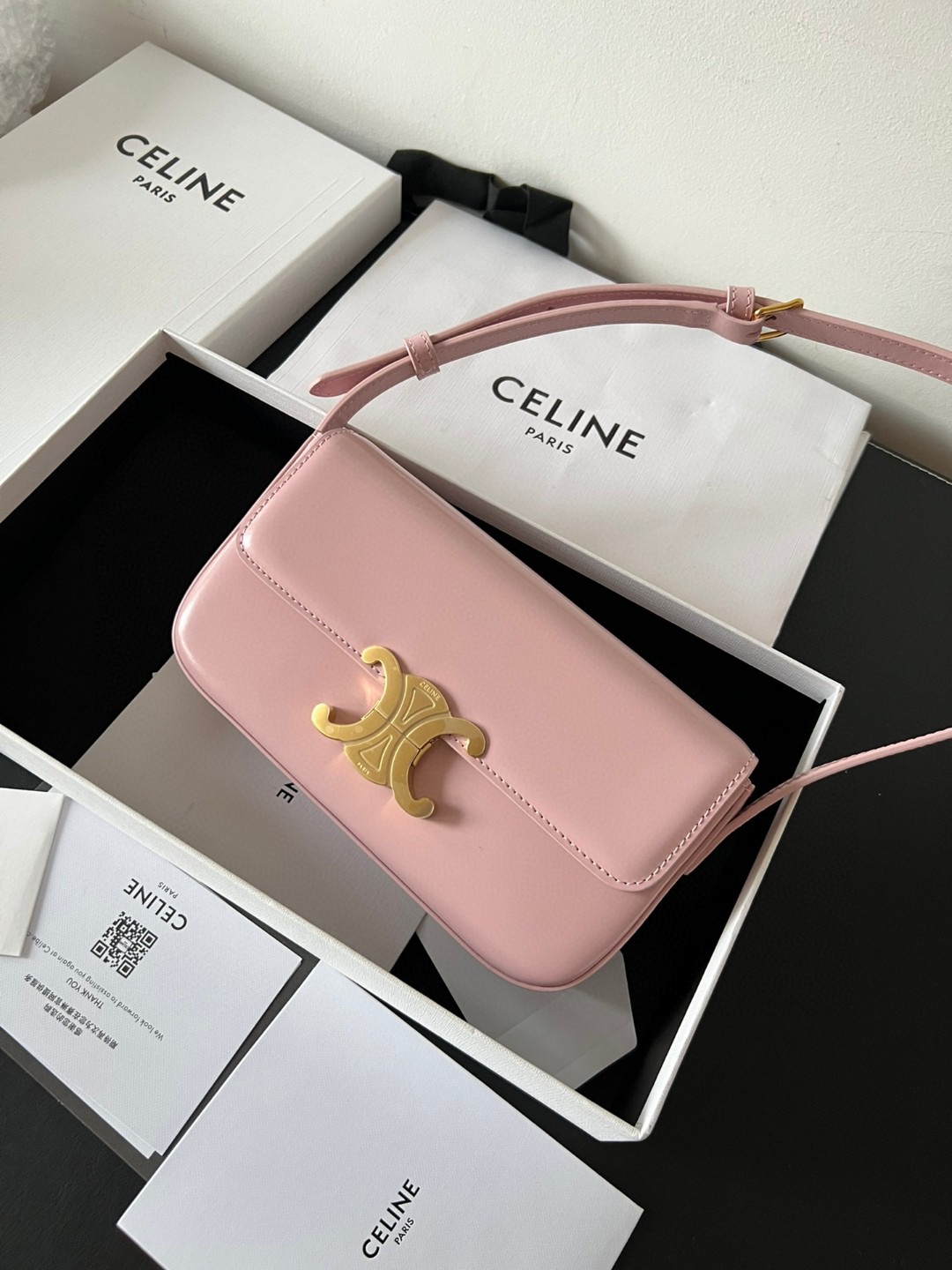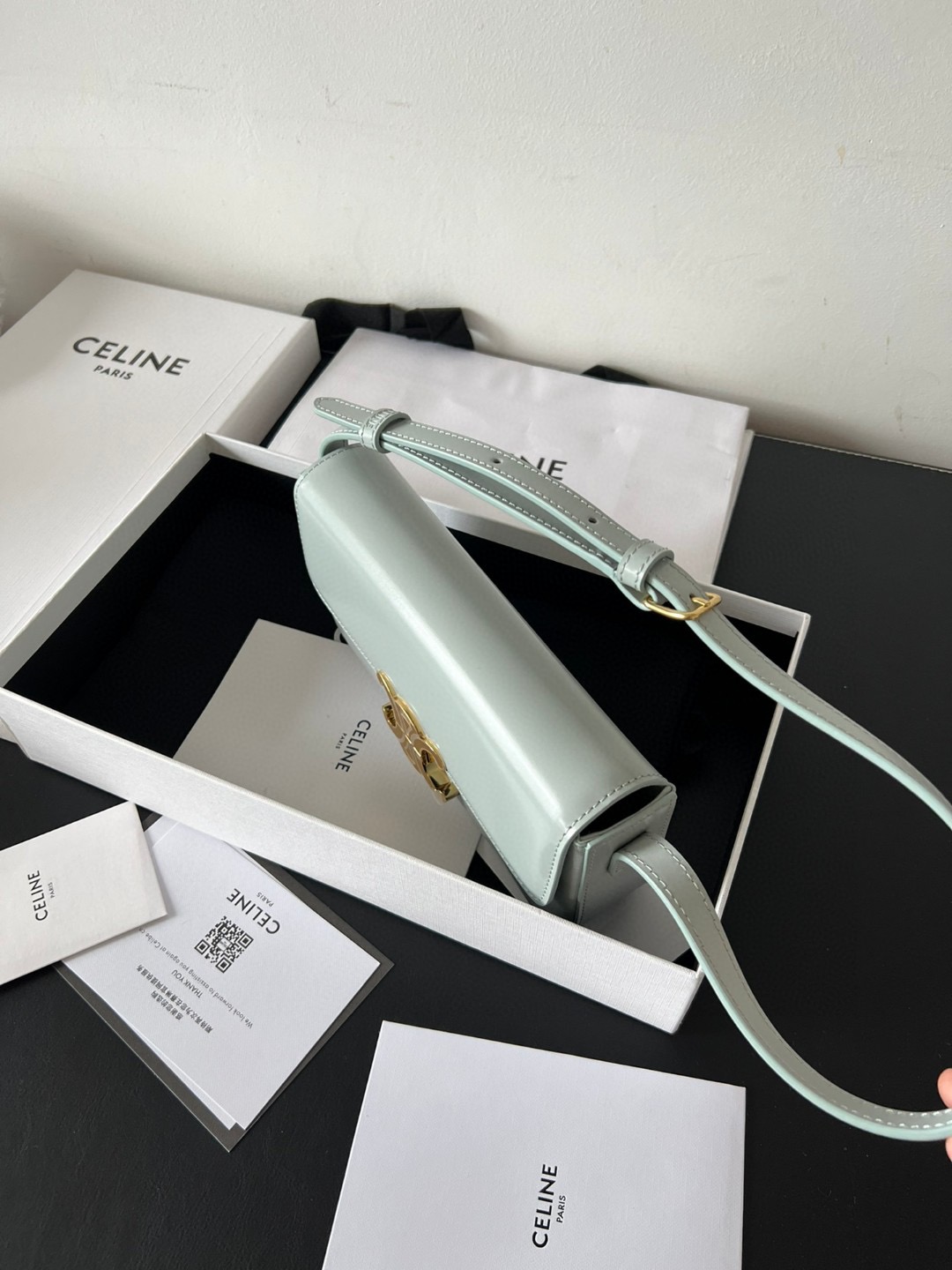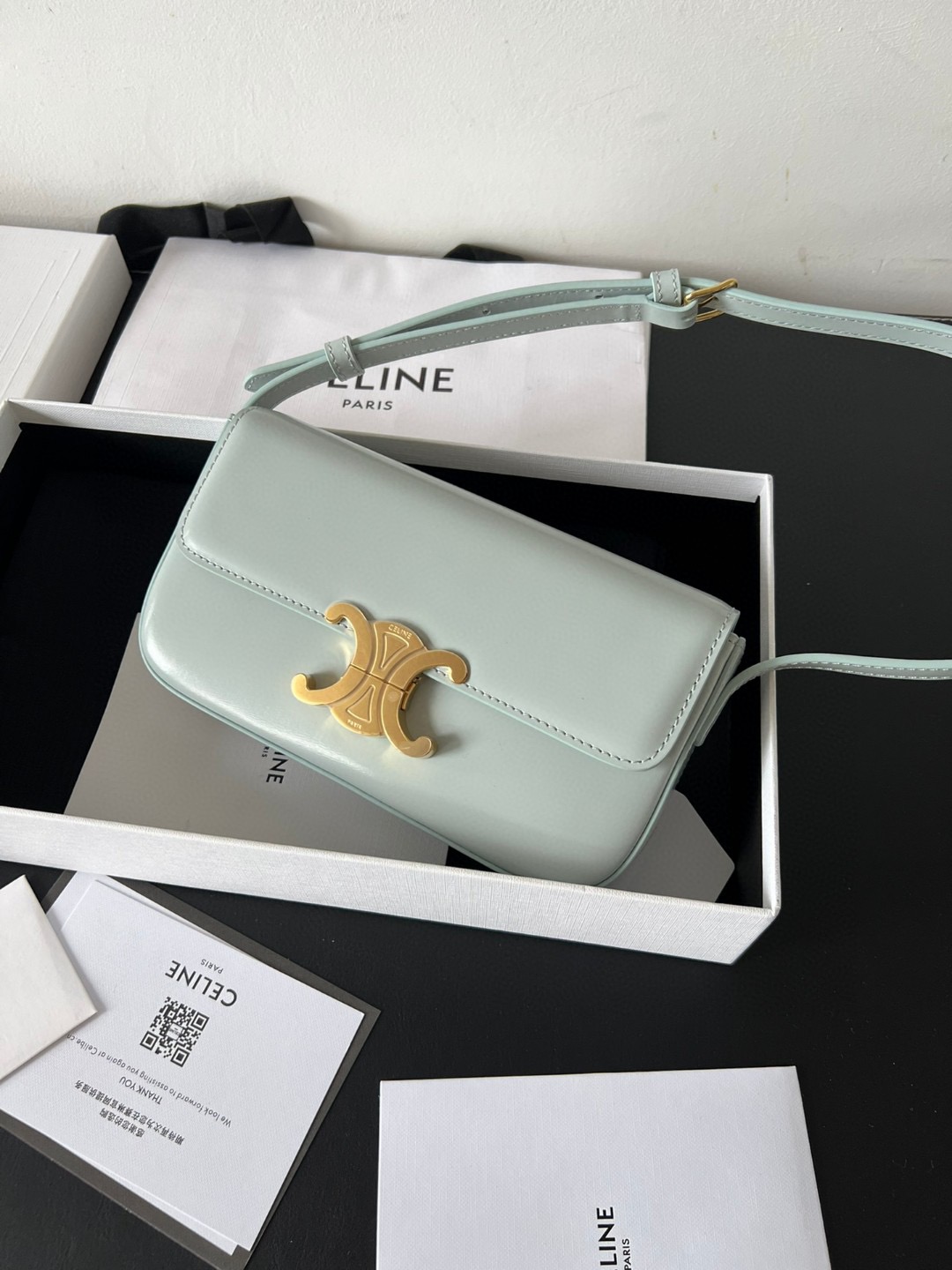 The bag boasts a beautifully minimalist design, with the spotlight shining on its exquisite leather craftsmanship. Its center is adorned with the elegant Triomphe Metallic Closure in gleaming gold hardware, where the iconic double C symbolizes Celine’s timeless style. Meticulously crafted from durable and robust calfskin leather, this versatile bag effortlessly transitions from special occasions to everyday wear, making it a chic and functional choice for any setting, including the workplace.