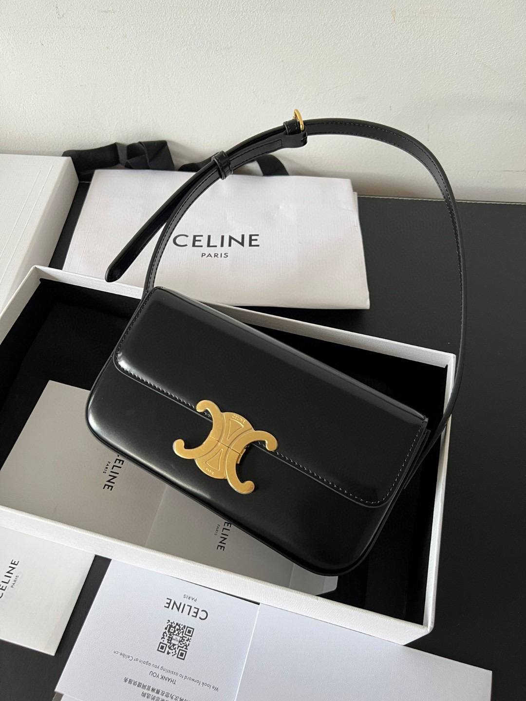 The Claude Shoulder Bag combines timeless elegance with practical design. Made from durable calfskin leather, it features the iconic Triomphe Metallic Closure in gold. Its minimalist look and versatile size make it ideal for both everyday wear and special occasions.