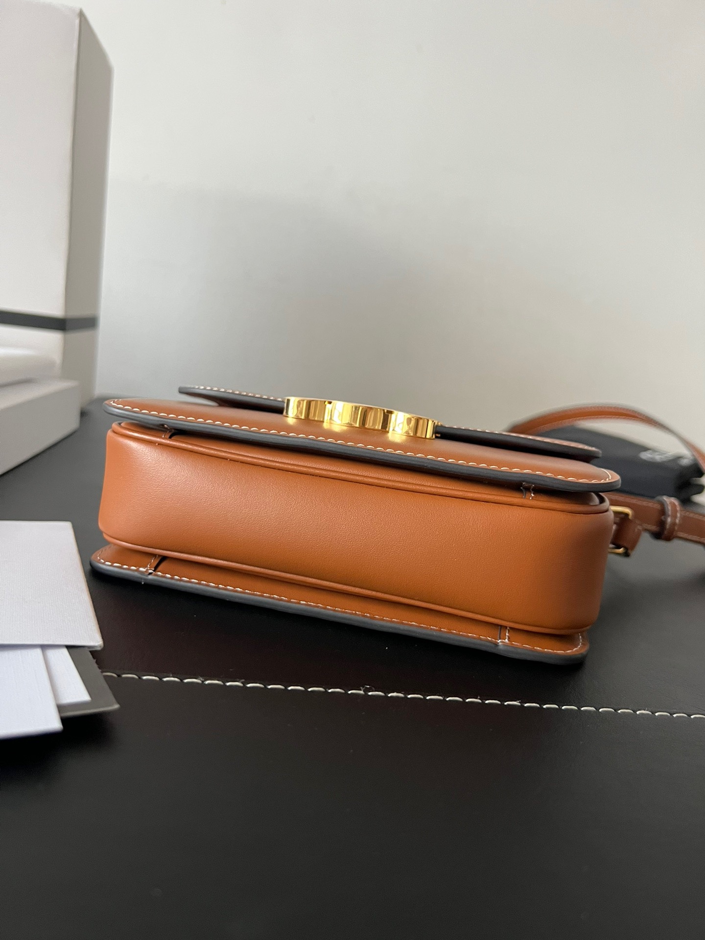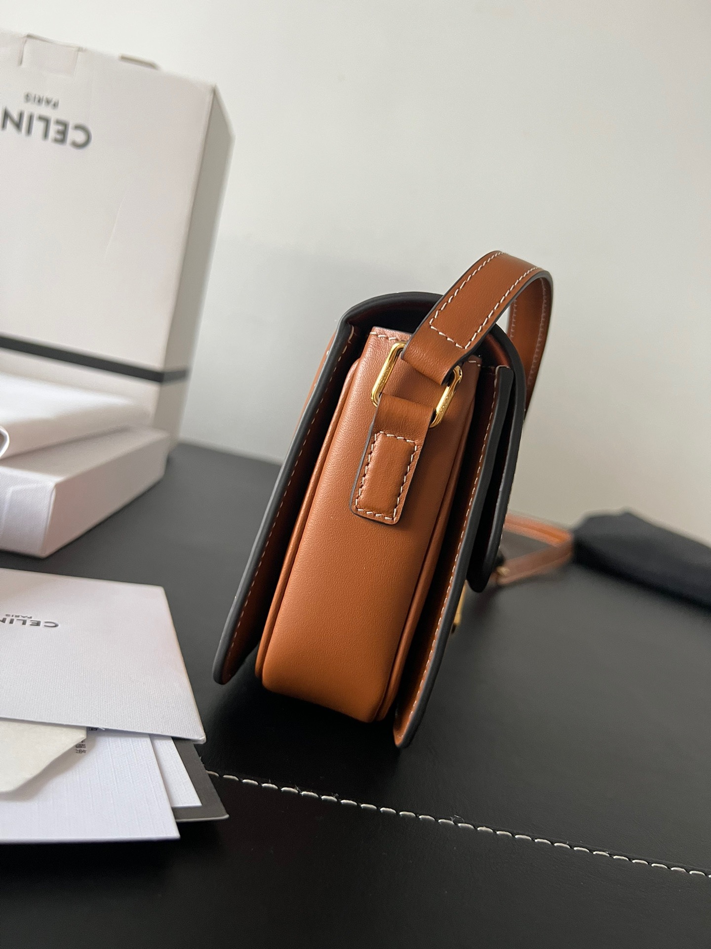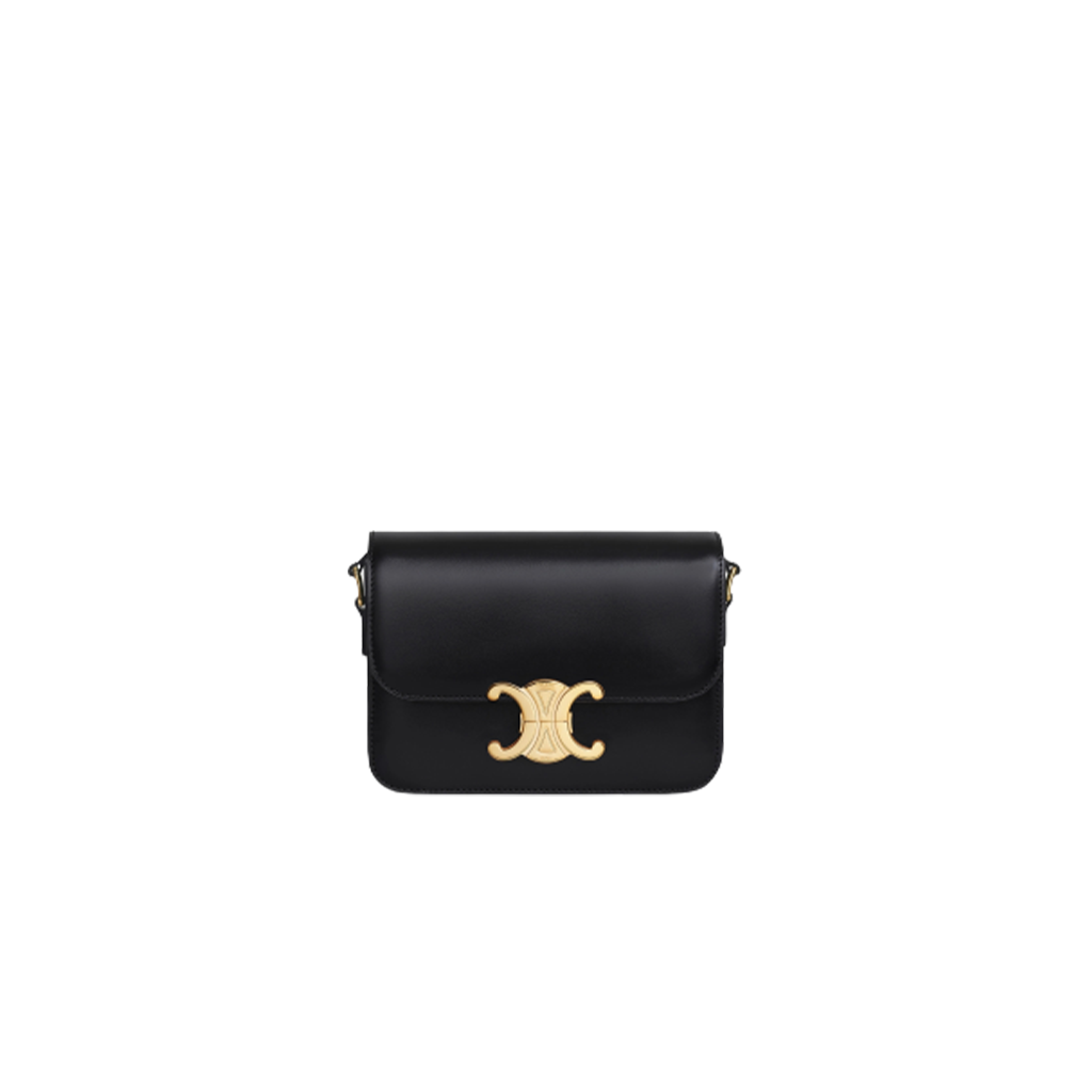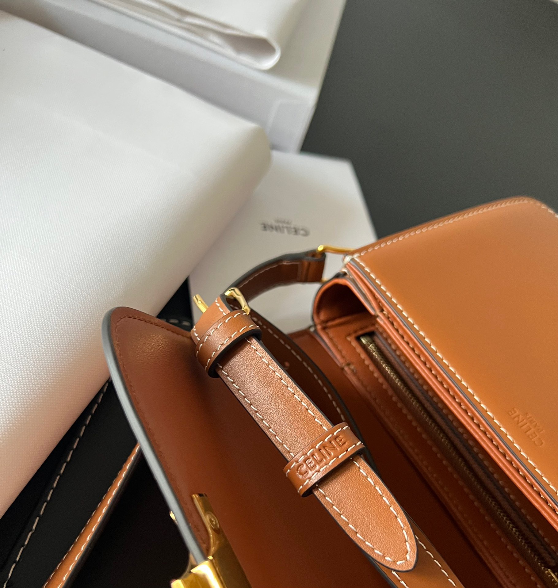 The Celine Teen Triomphe combines sleek leather with a golden logo clasp, embodying timeless elegance and modern sophistication.