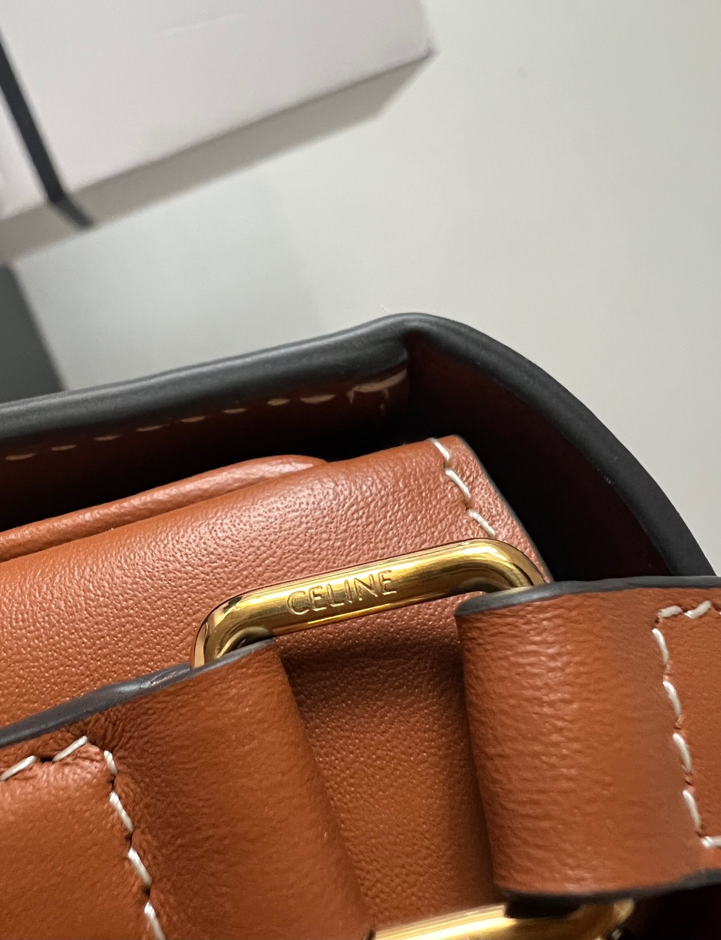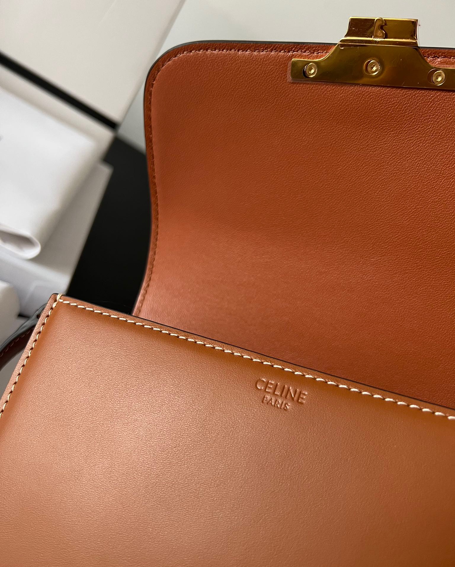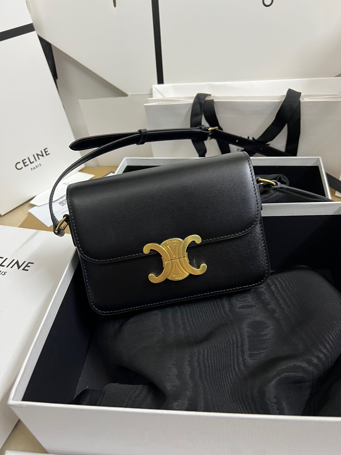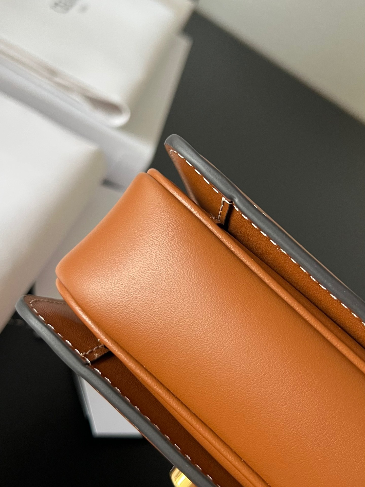 The Celine Teen Triomphe combines sleek leather with a golden logo clasp, embodying timeless elegance and modern sophistication.