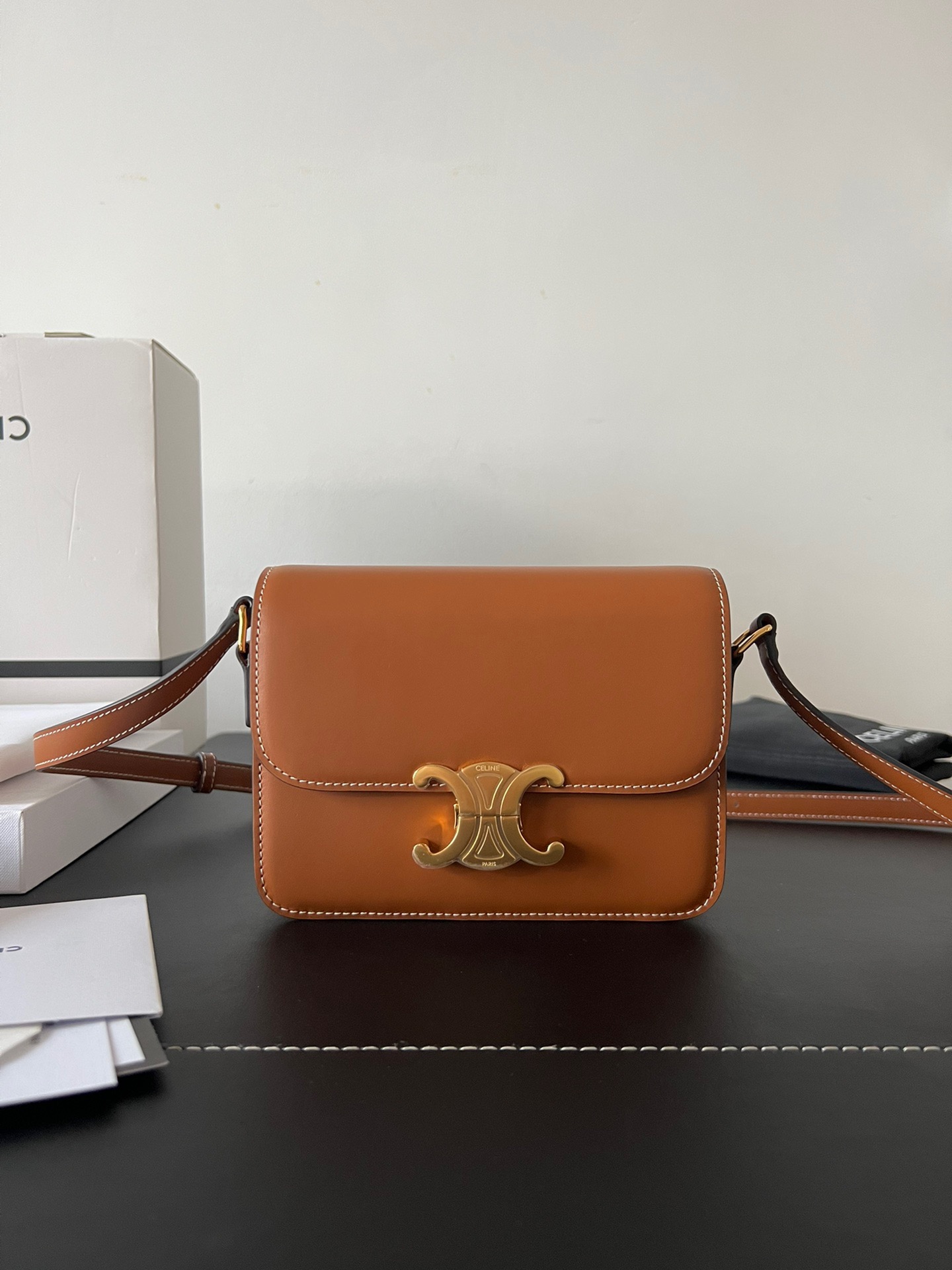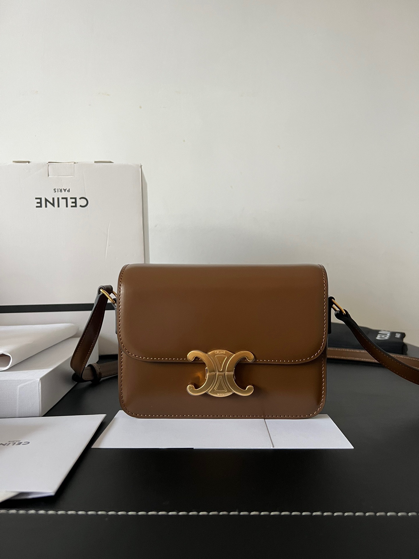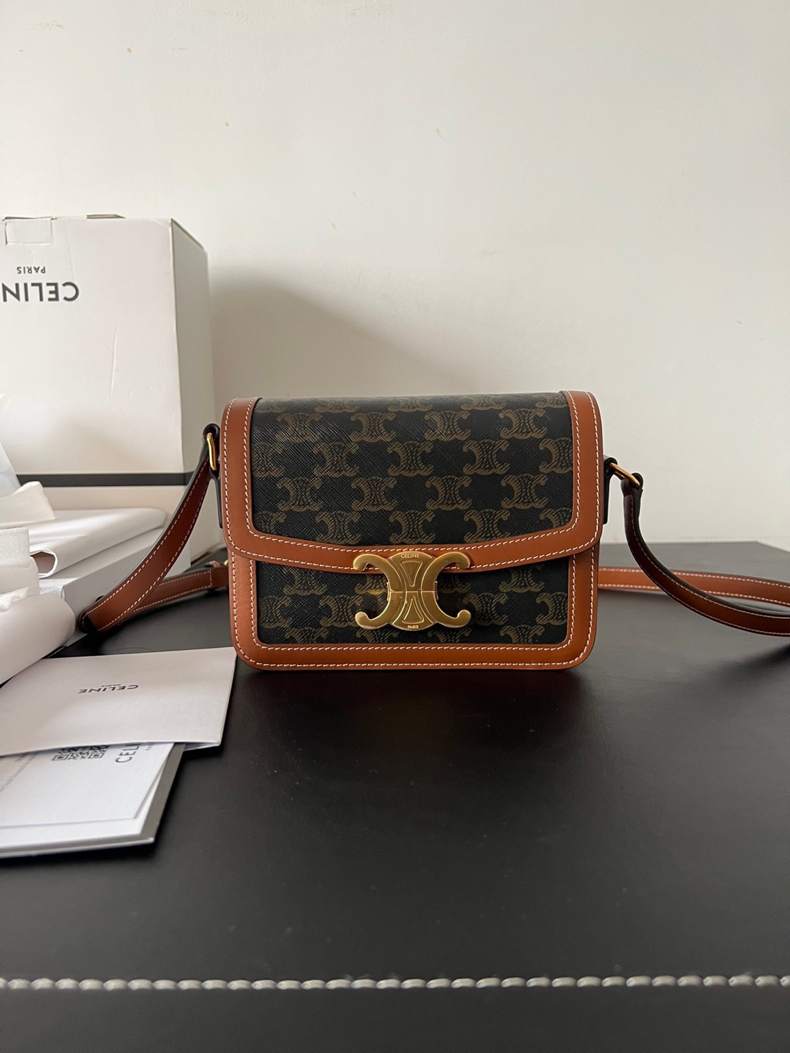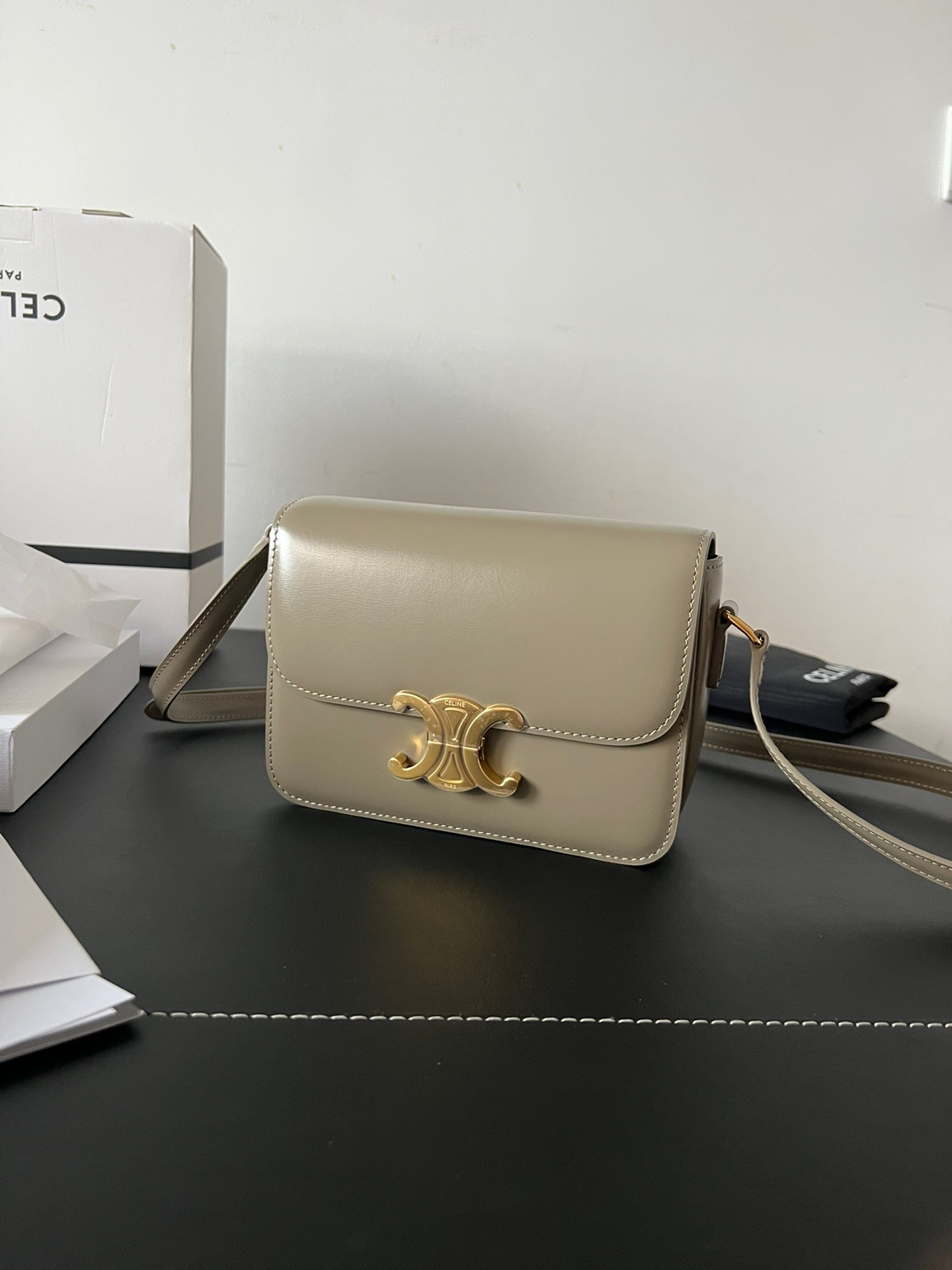 The Celine Teen Triomphe combines sleek leather with a golden logo clasp, embodying timeless elegance and modern sophistication.