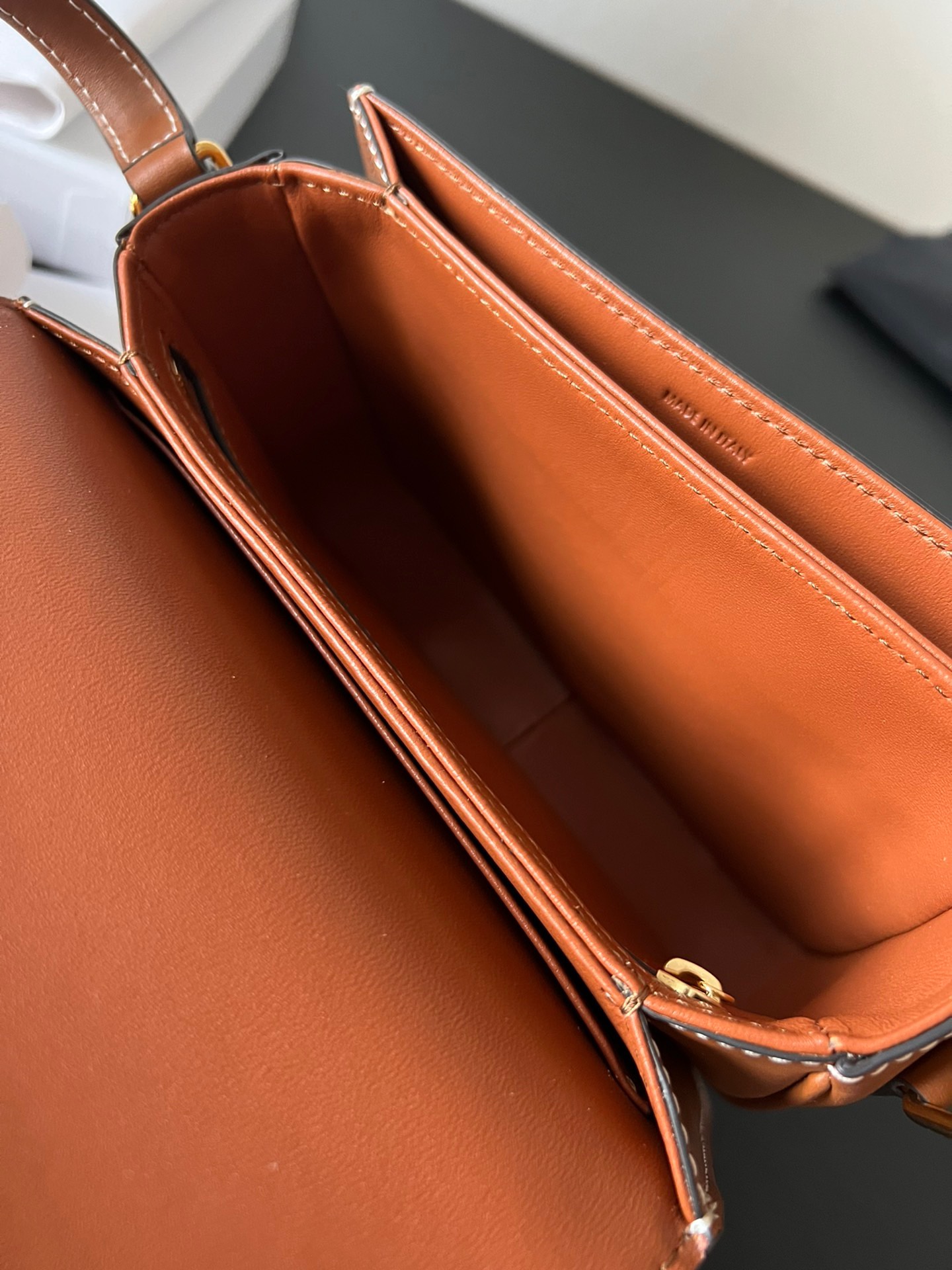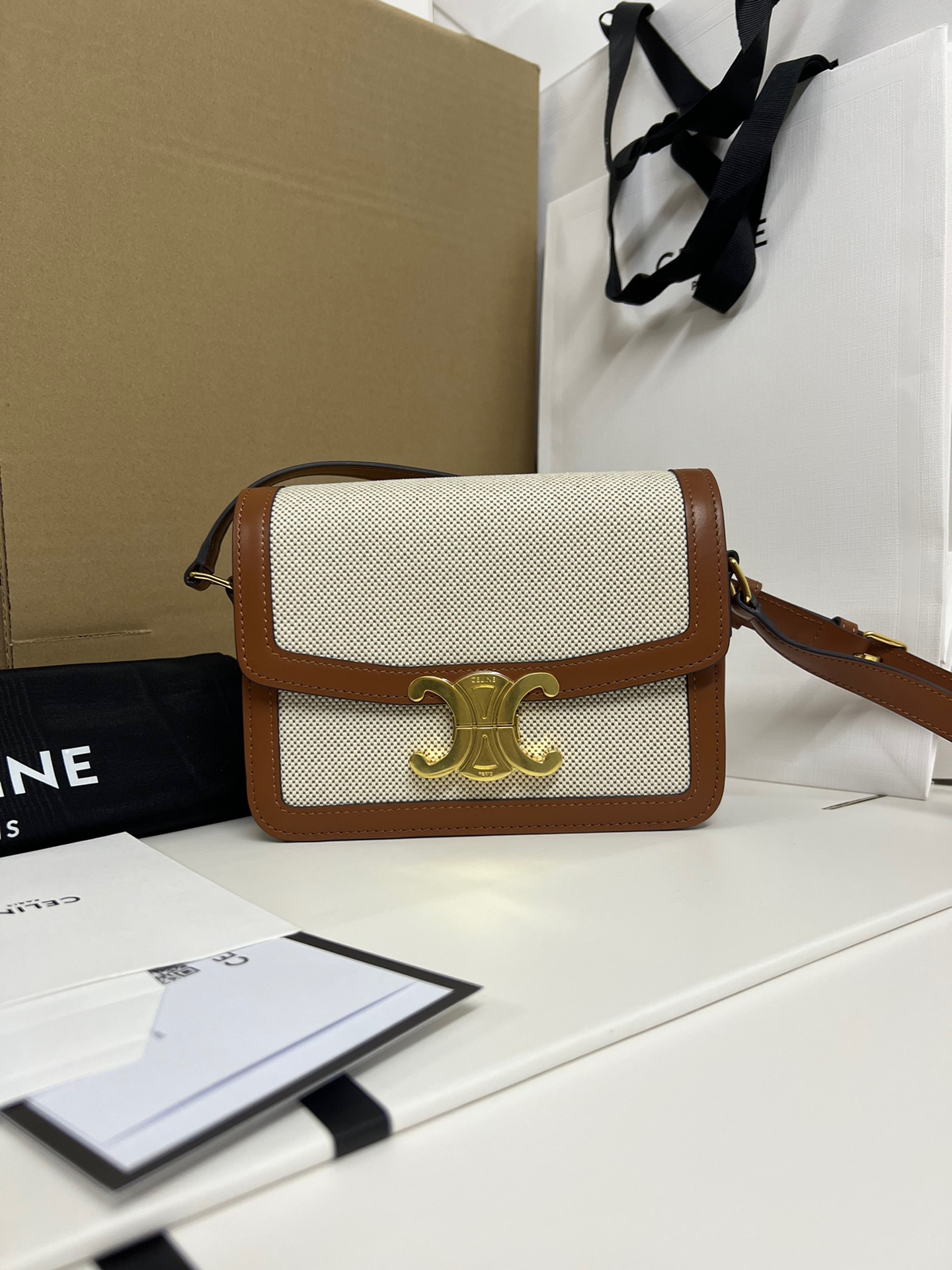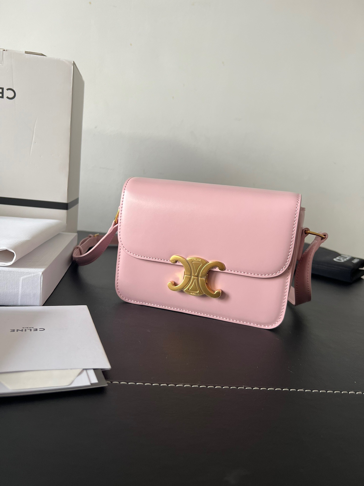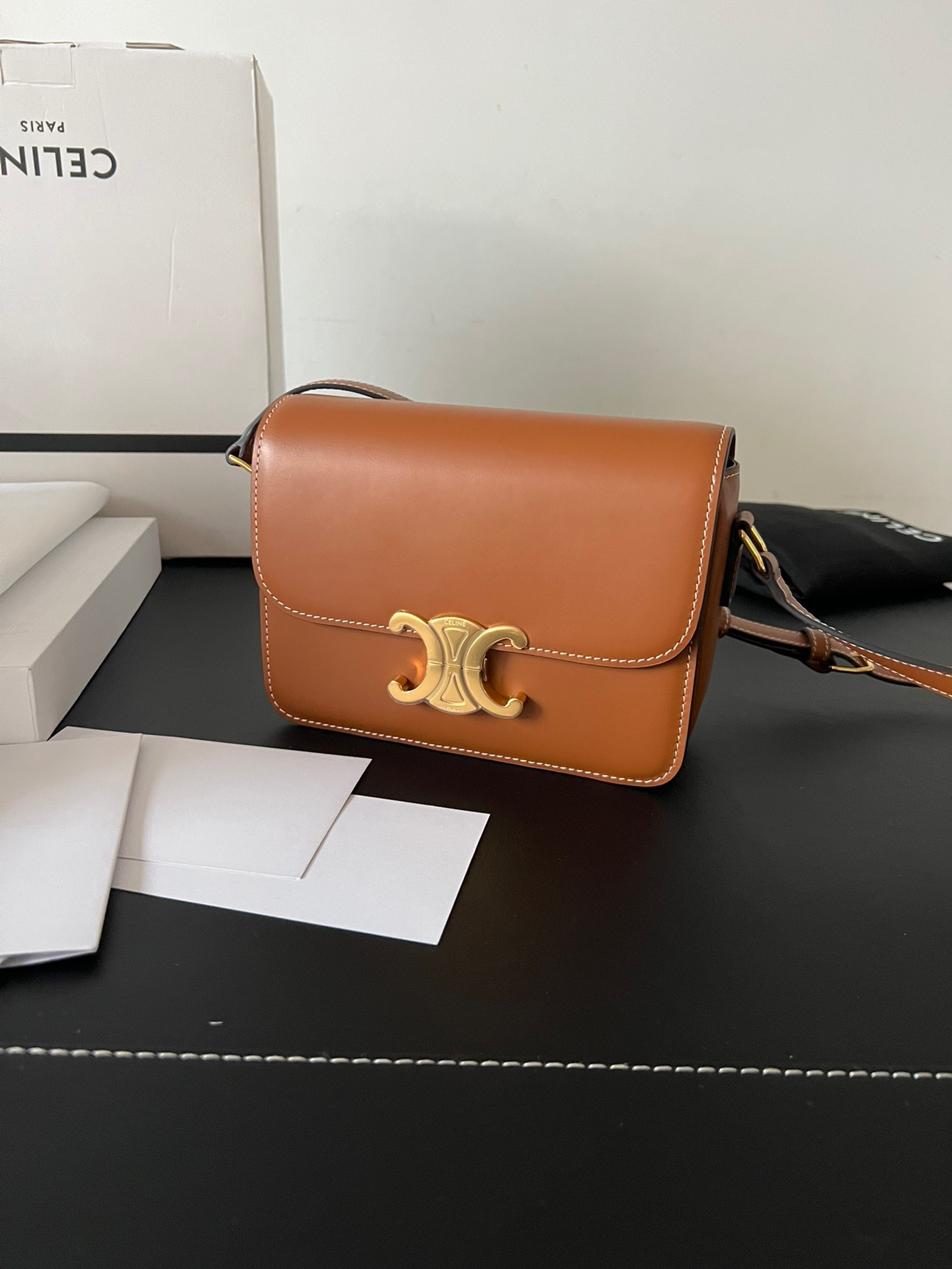 The Celine Teen Triomphe combines sleek leather with a golden logo clasp, embodying timeless elegance and modern sophistication.