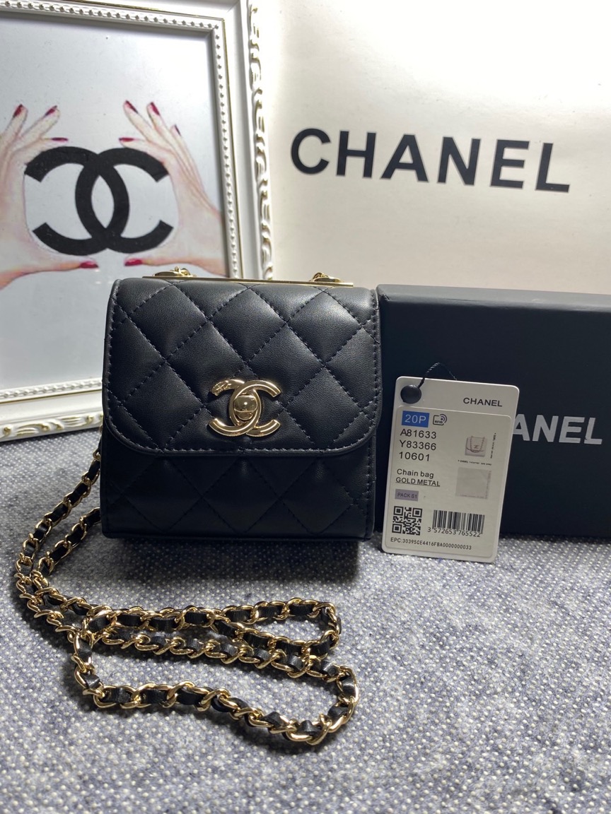 Introducing the *ANEL CC Clutch with Chain – a sophisticated and trendy accessory crafted with utmost care from luxurious quilted lambskin leather. This exquisite clutch showcases a beautifully woven leather chain strap, along with a flawless logo metal plate and aged gold-tone hardware. Unlock its elegance with a convenient turn-lock closure, revealing a refined black fabric interior adorned with practical slip pockets.