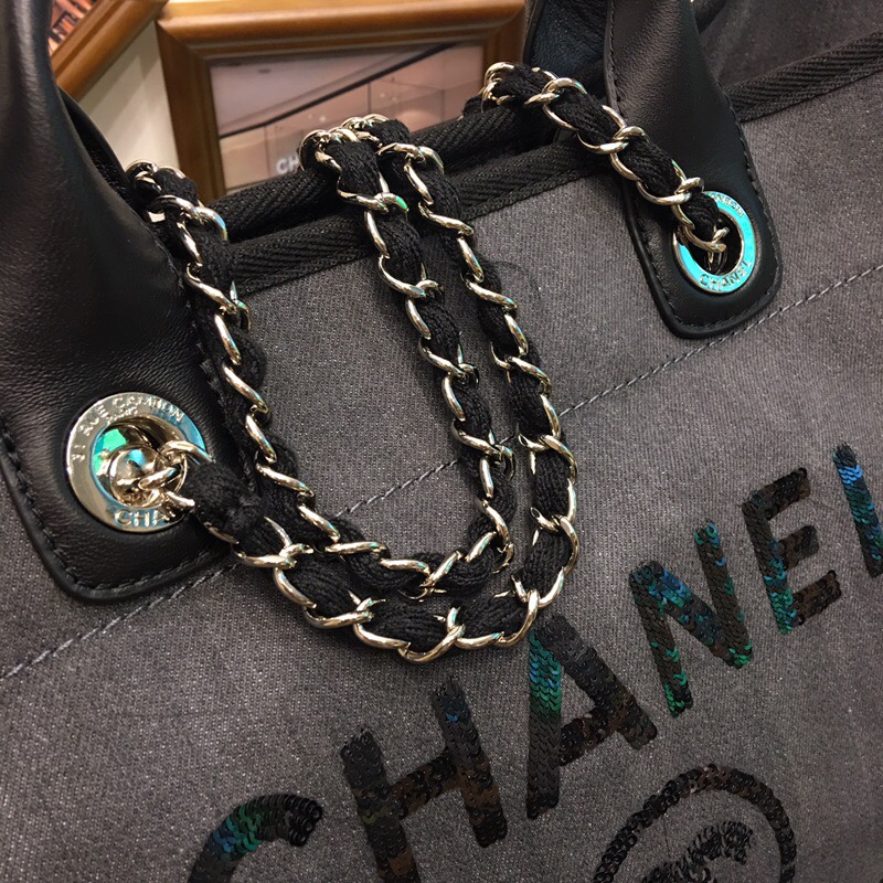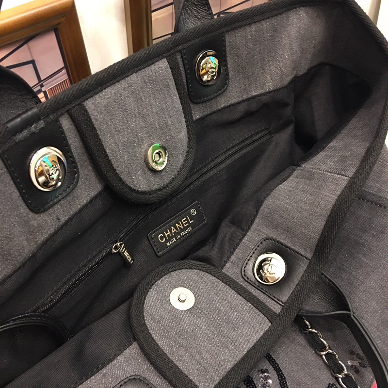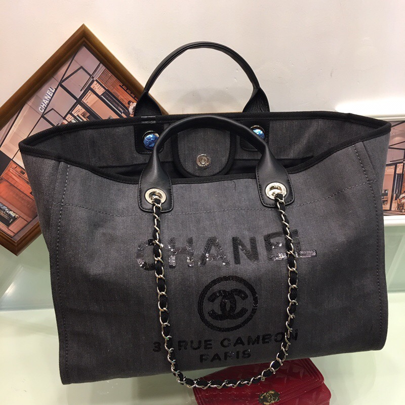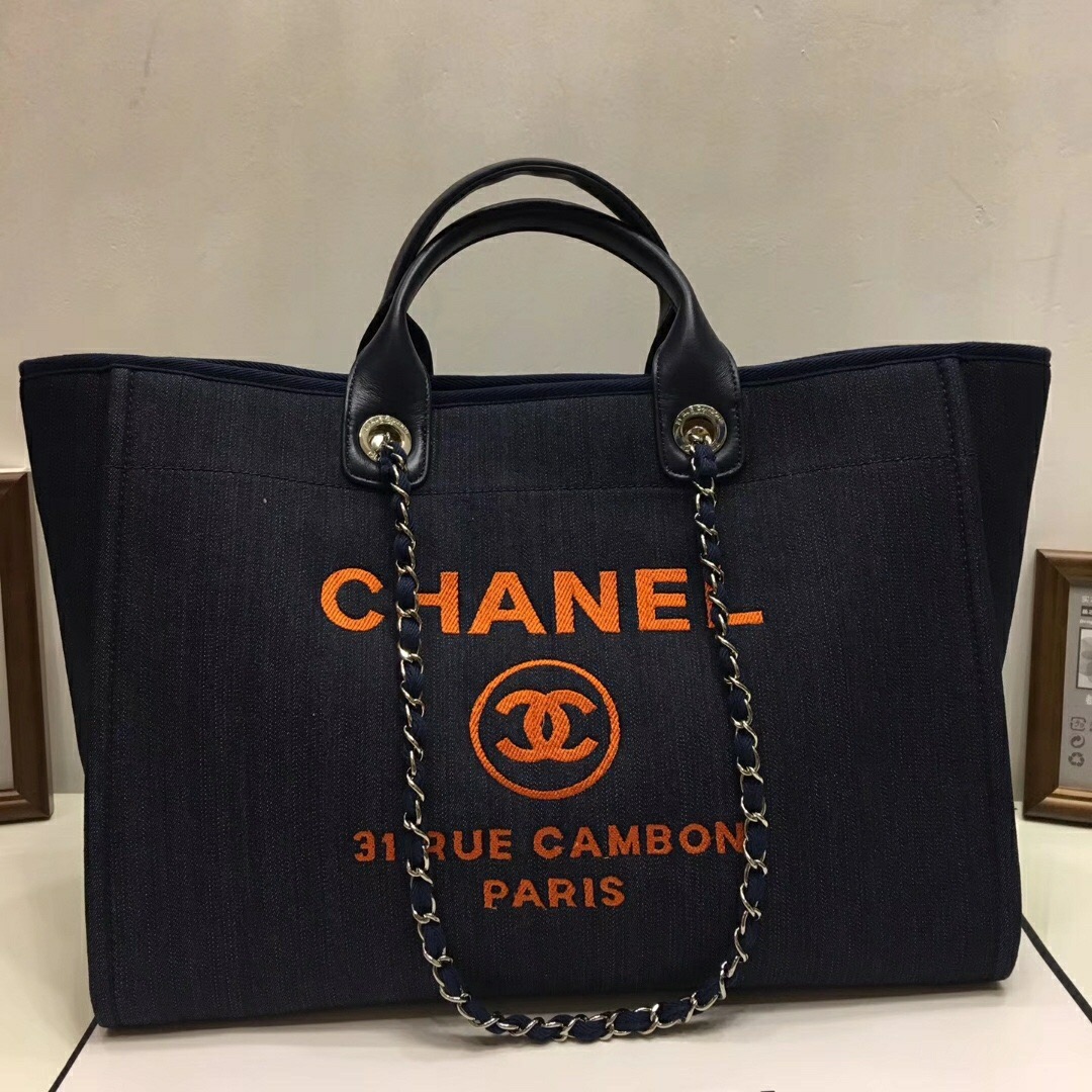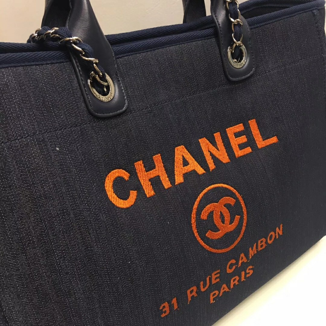 Introducing an exquisite *ANEL Denim Canvas Small Deauville Tote, embodying both high-quality craftsmanship and original design. This much-adored tote is adorned with a delightful *ANEL stitched logo, tastefully printed on fine denim canvas. The bag boasts metal threaded chain shoulder straps, accentuated with luxurious leather shoulder pads, along with elegant canvas trim and an effortless open top. Opening up to reveal a generously spacious fabric interior, complete with convenient zipper and patch pockets, this irresistible accessory flawlessly combines utility with timeless style. Perfect for your everyday necessities and retail therapy, embrace this classic masterpiece to elevate your fashion repertoire.