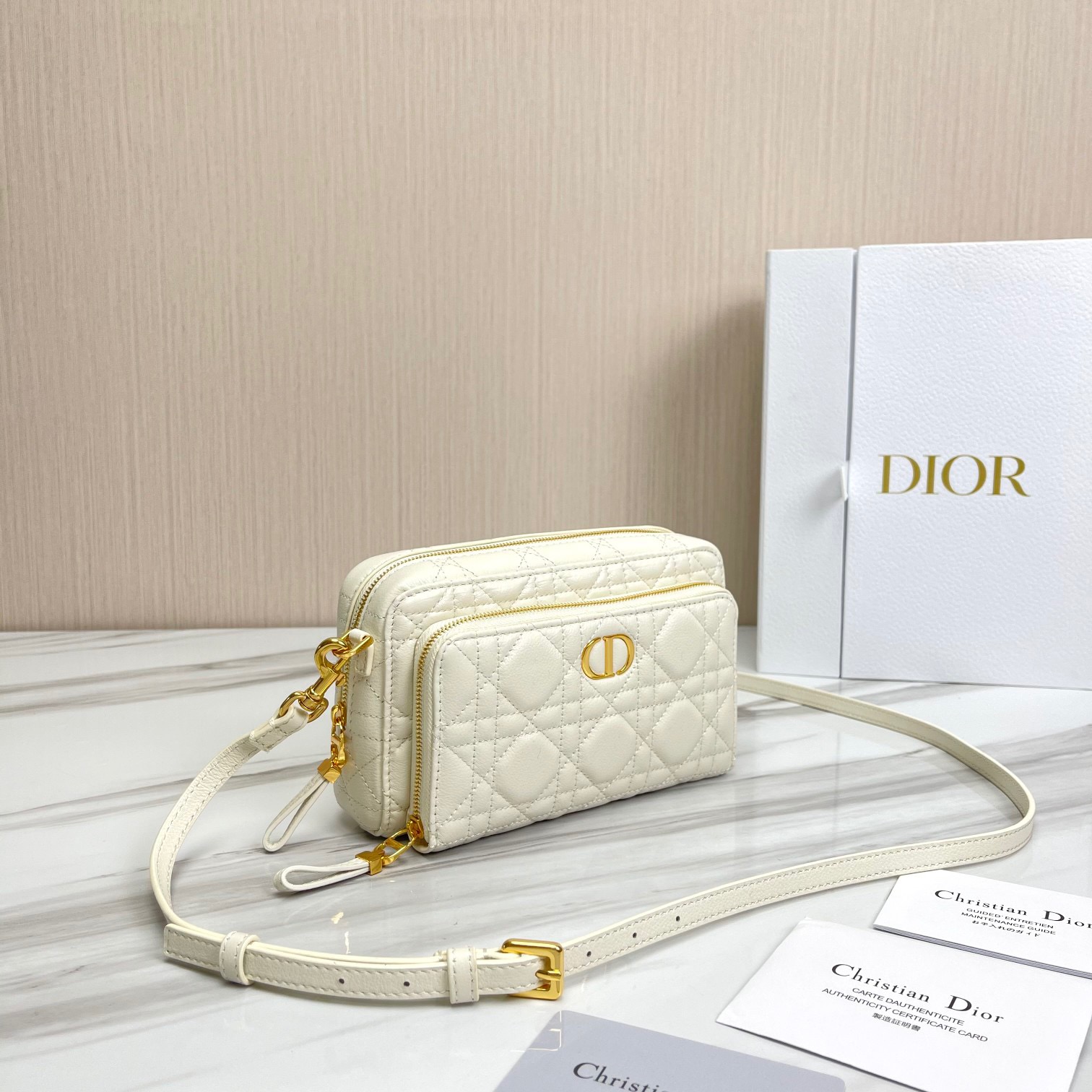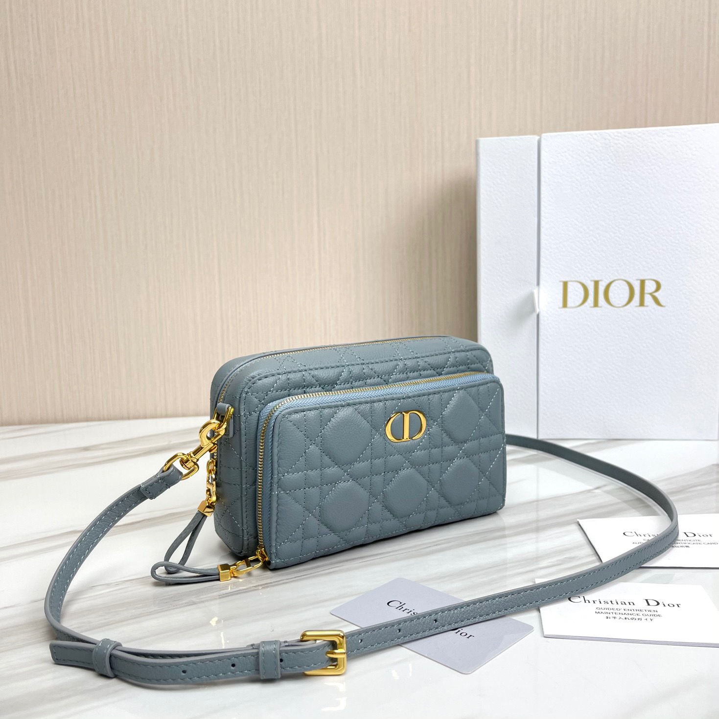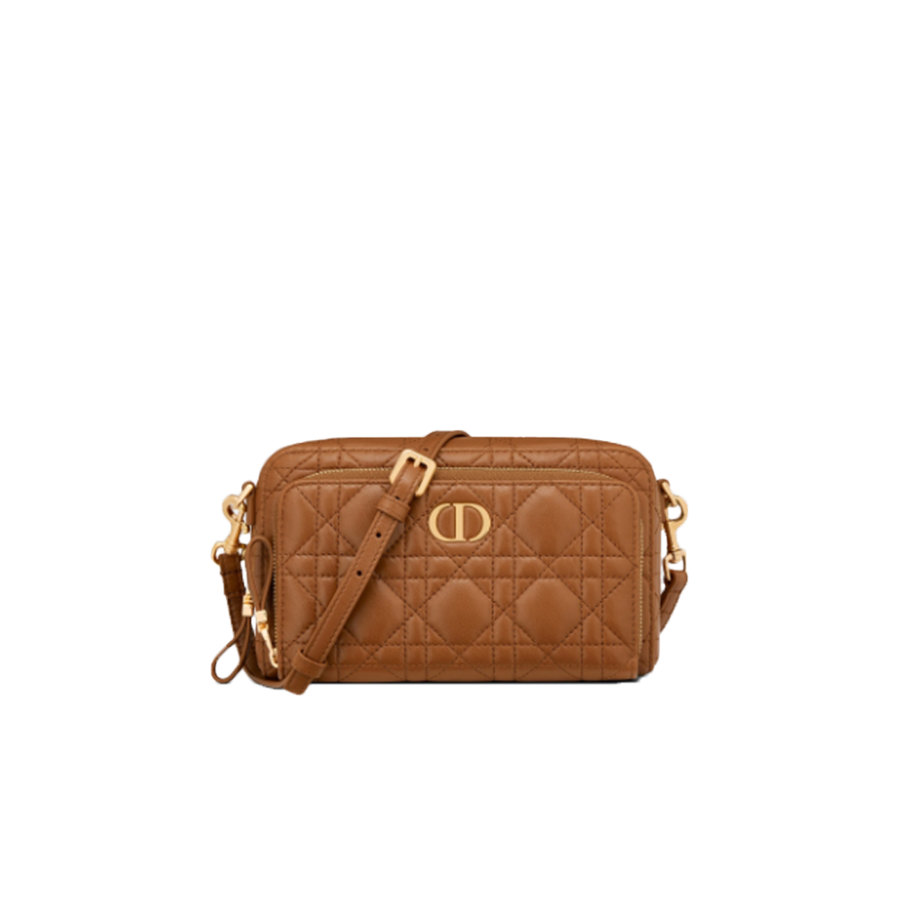 The Caro Double Pouch is a chic everyday essential. Crafted in taupe calfskin with Cannage stitching, it’s compact, spacious, and versatile, with a removable strap for effortless style on any occasion.