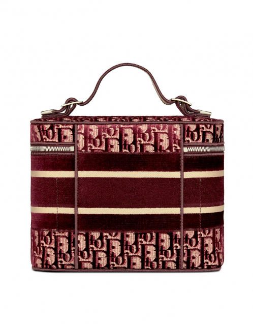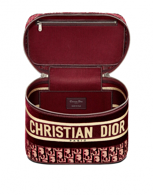 The DiorTravel Vanity Case in burgundy Oblique velvet exudes elegance with its Cannage motif and ‘Christian Dior’ signature. A chic, functional accessory for organized luxury on the go.