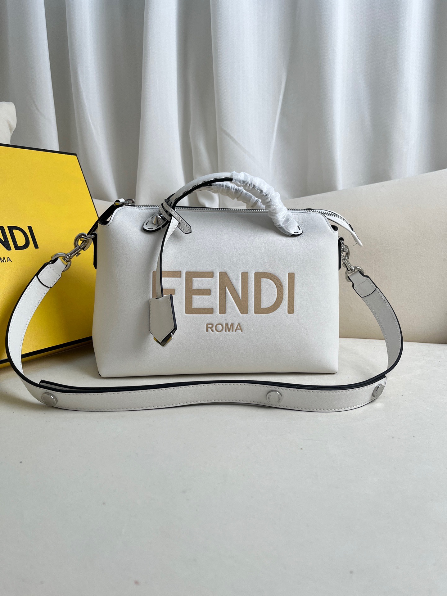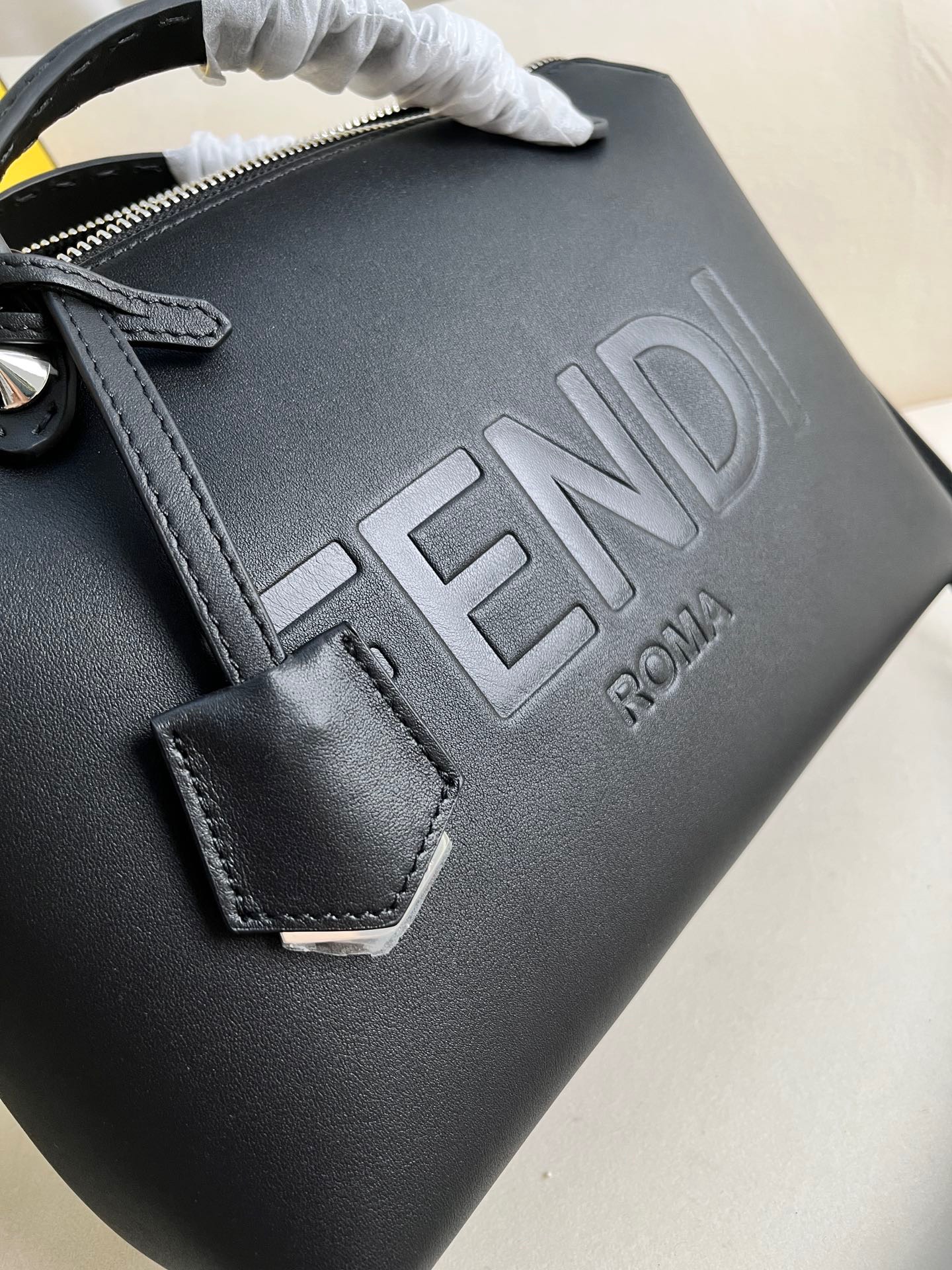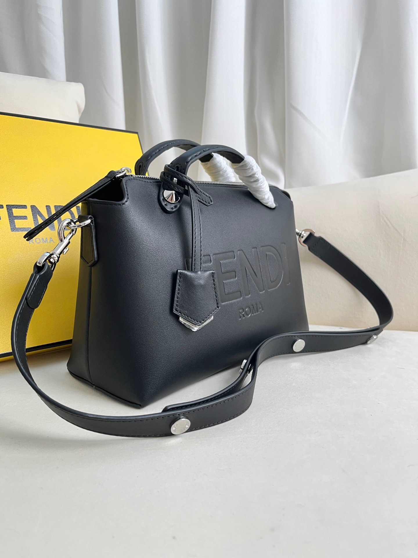 Introducing the medium-sized iconic By The Way Boston bag, expertly crafted from luxurious leather and adorned with the prestigious “*ENDI ROMA” hot-stamp detail, elegantly sealed with a secure zipper closure. Versatility meets style with multiple carrying options, as you can gracefully hold it by the handles, sling it over your shoulder, or even wear it cross-body, thanks to the adjustable and detachable shoulder strap. Elevate your everyday with the By The Way Boston bag, where elegance meets functionality.