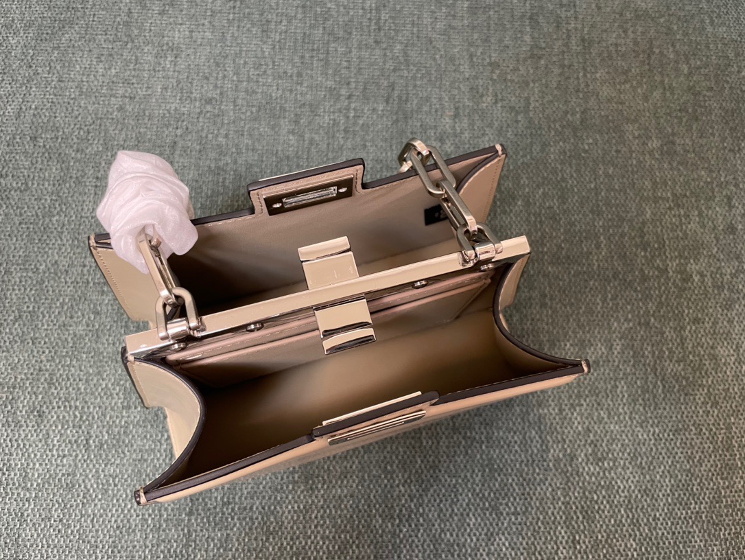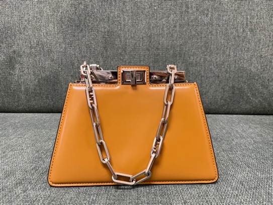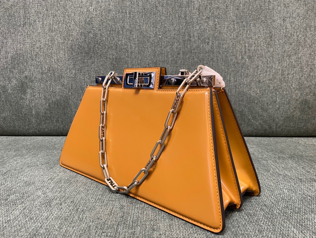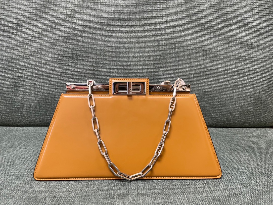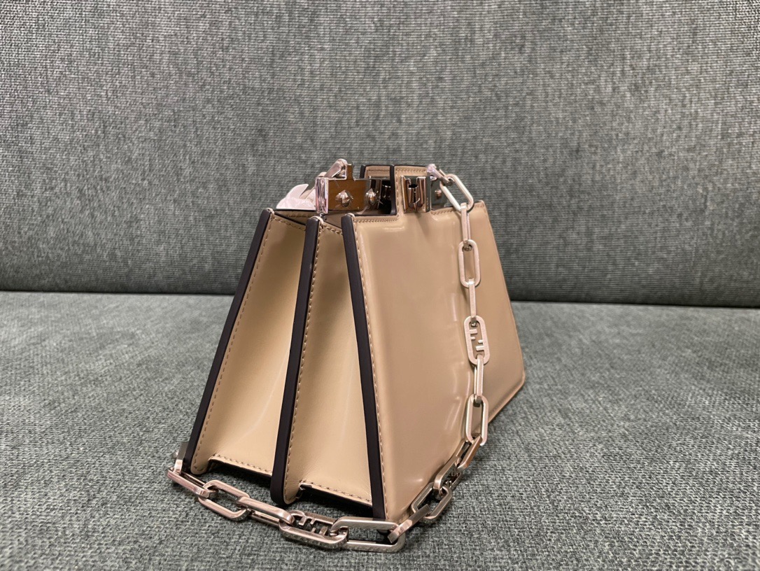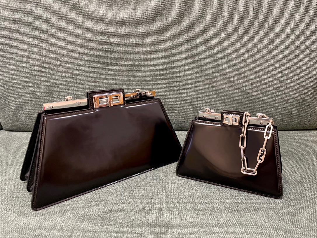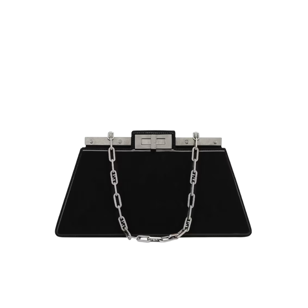 The Peekaboo Cut bag redefines elegance with its horizontal cut design, showcasing signature twist lock and metal bar. Versatile for hand or shoulder carry, it’s a modern classic.