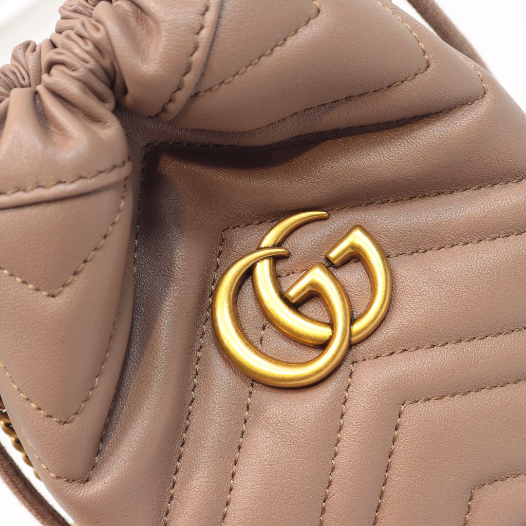 The GG Marmont Mini Bucket Bag exudes vibrant charm and timeless elegance. Crafted from Matelassé leather, its iconic Double G emblem, chain strap, and drawstring closure make it a versatile, stylish accessory.