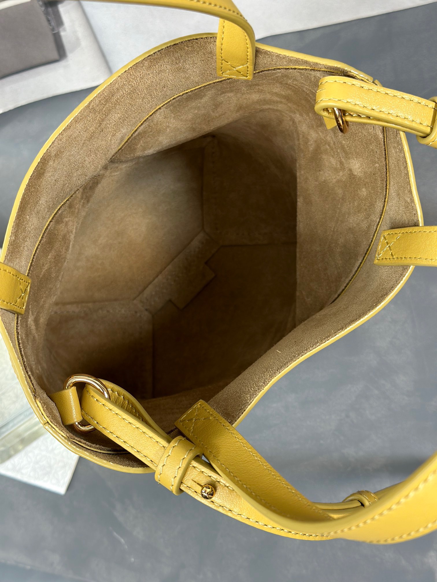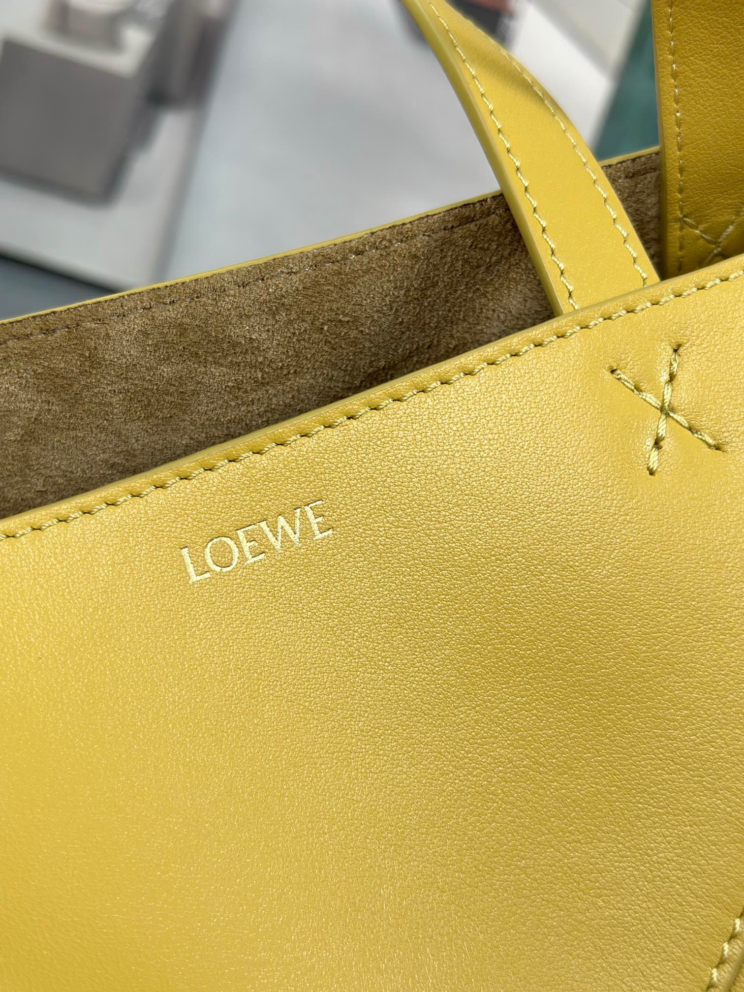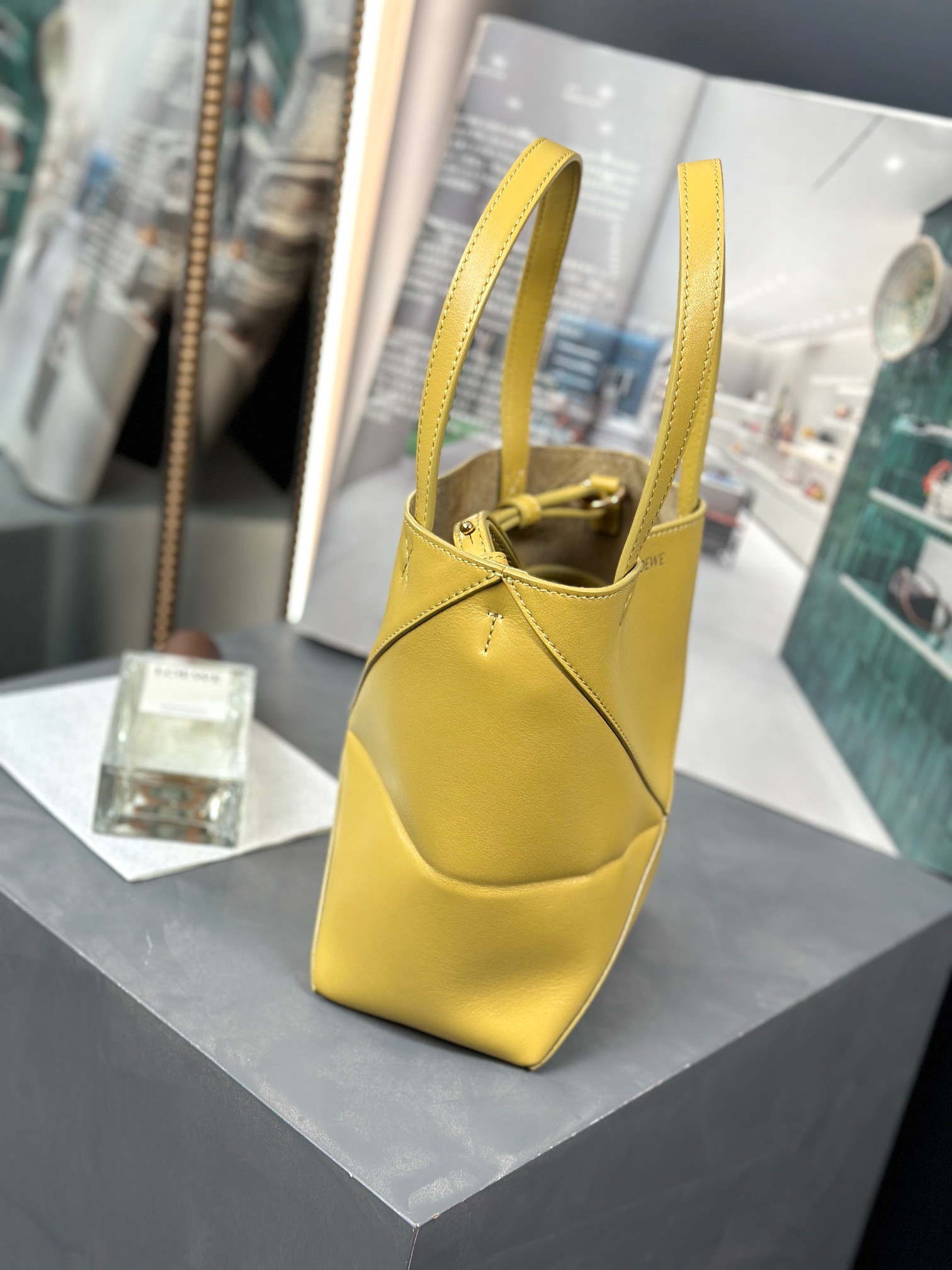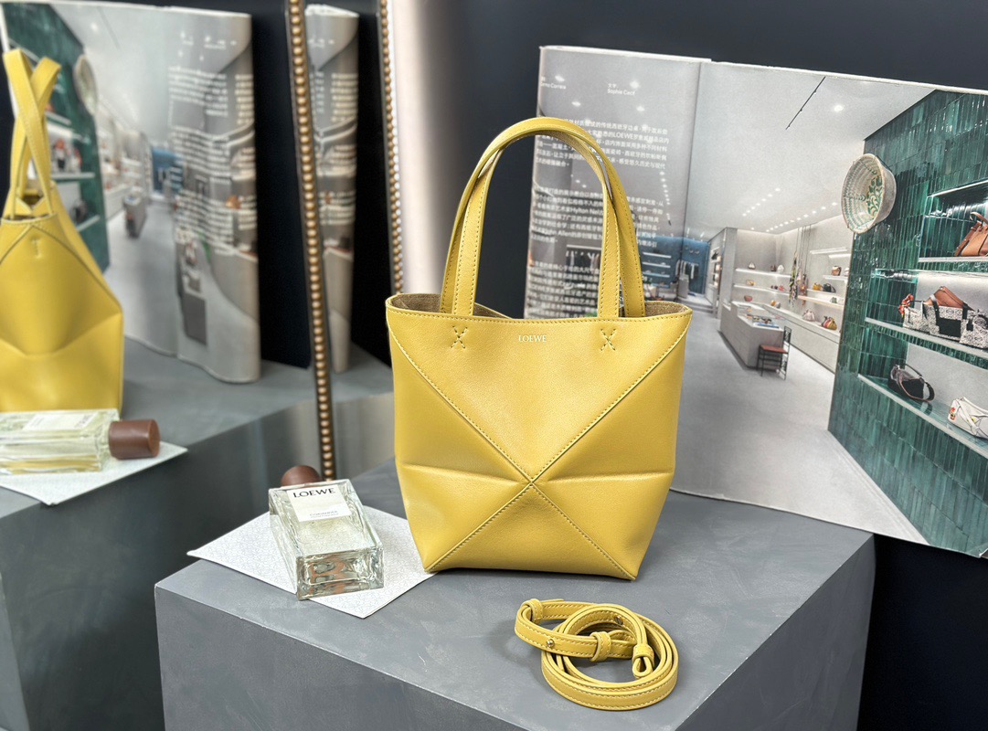 The Puzzle Fold Tote seamlessly incorporates the iconic bag’s distinctive geometric design into a visually striking and architecturally inspired series of panels. This innovative construction enables the bag to fold completely flat, making it an ideal travel companion. Crafted with care, this medium-sized version is fashioned from shiny calfskin, boasting a soft and lightweight feel. It exudes elegance with its discreet *OEWE branding.