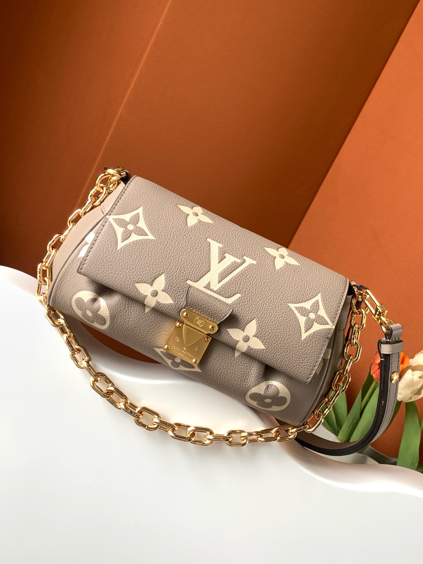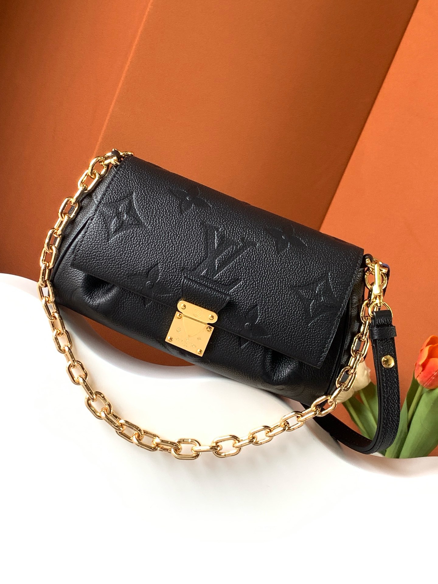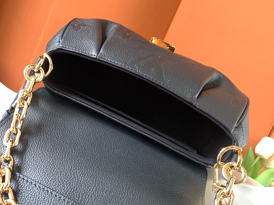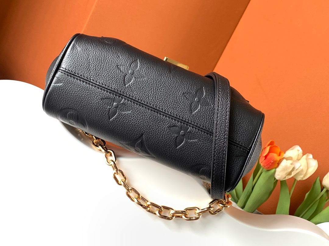 This Favorite bag strikes a balance between style and practicality! Its supple textured leather and stamped Monogram give it a classy look, while the gold-colored lock adds a lovely detail. The changeable strap works great for daytime use, and the chain offers a more formal option for nights out. It suits any event!
