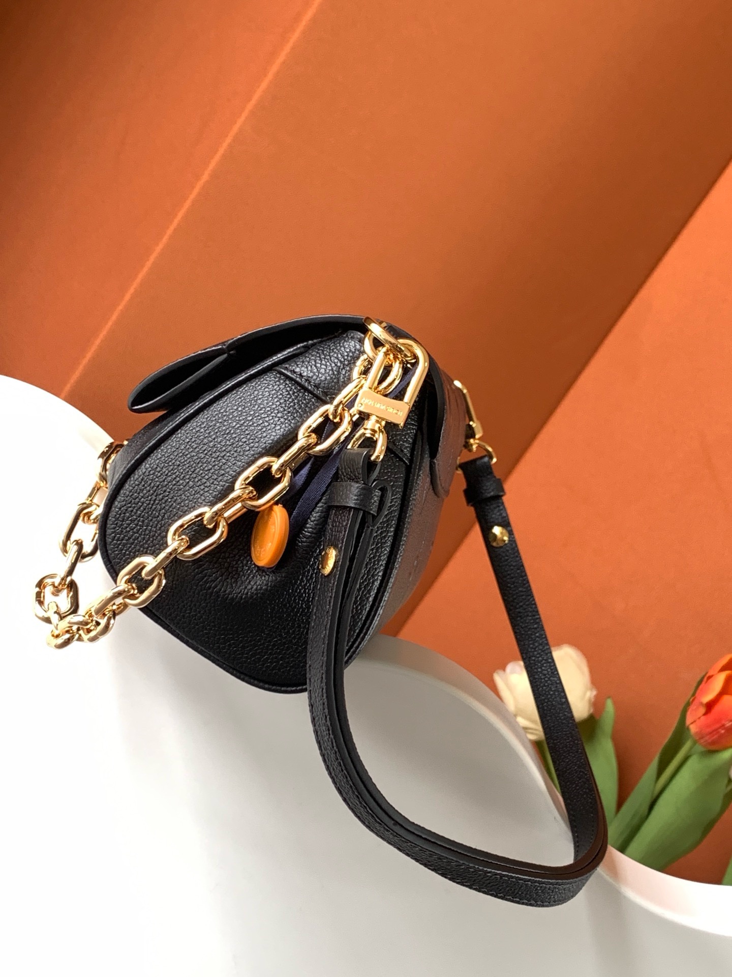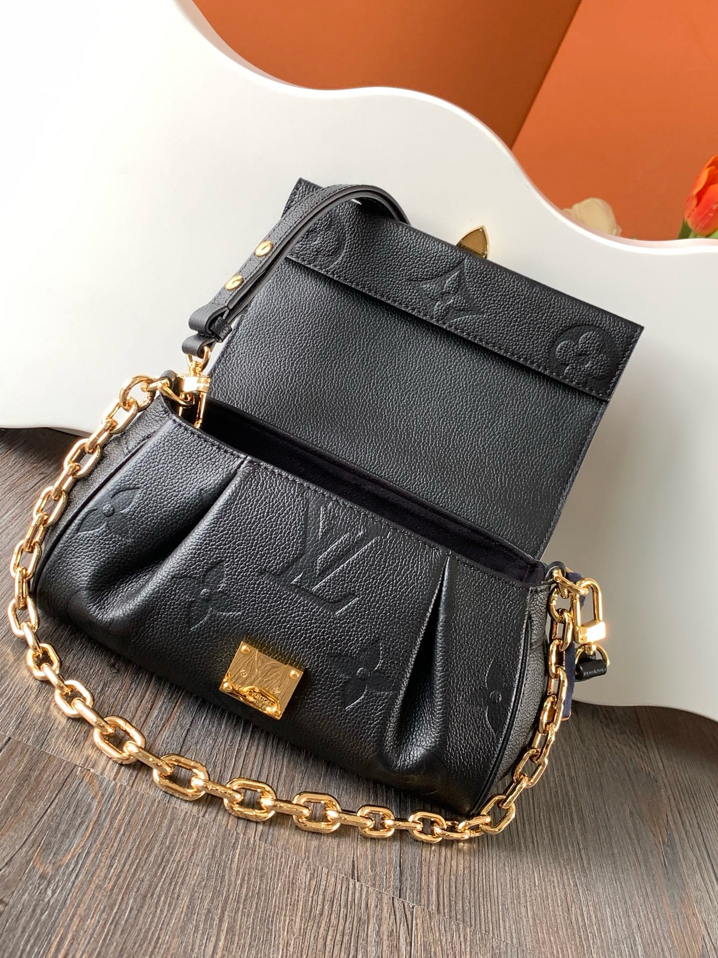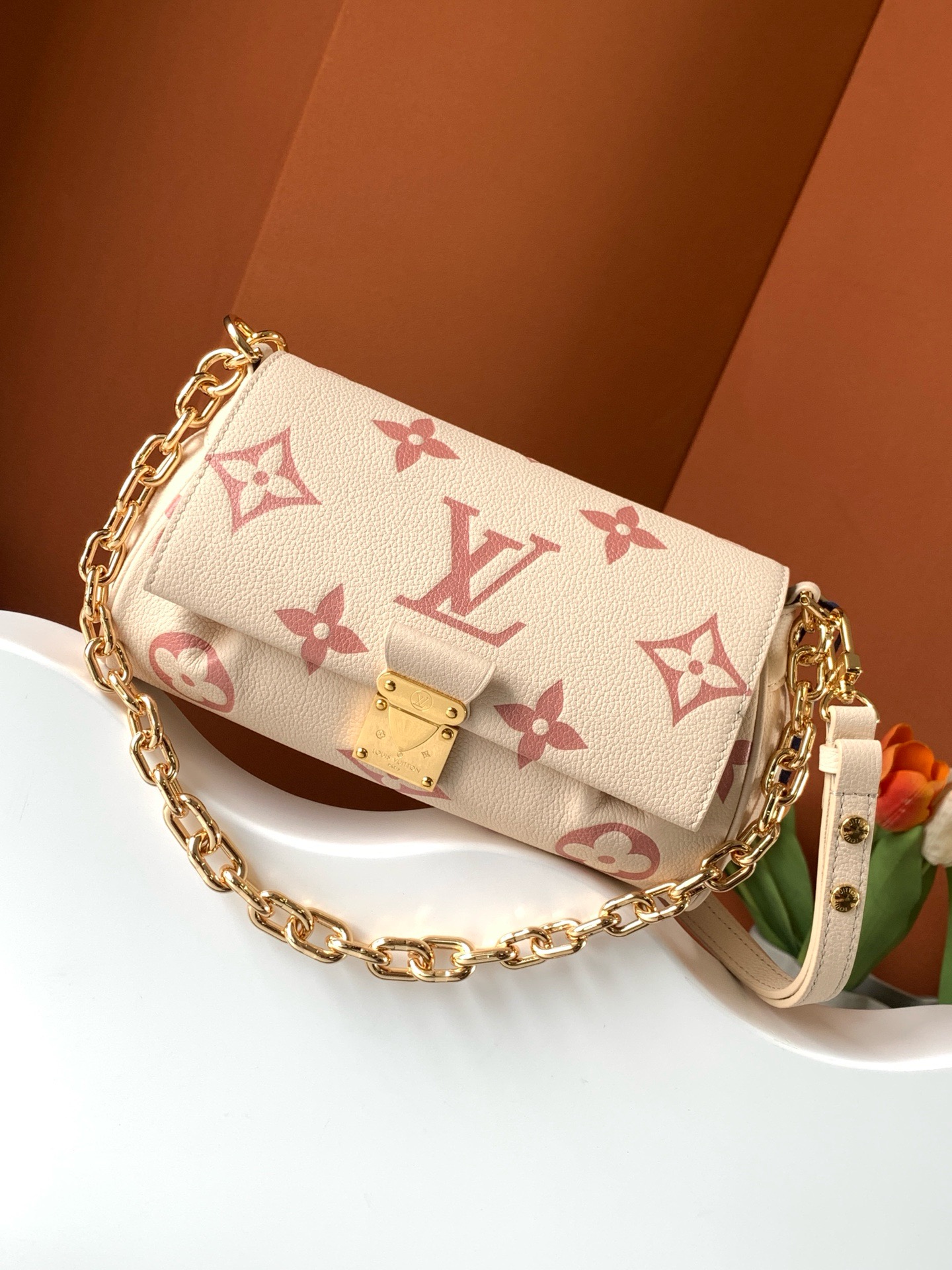 This Favorite bag strikes a balance between style and practicality! Its supple textured leather and stamped Monogram give it a classy look, while the gold-colored lock adds a lovely detail. The changeable strap works great for daytime use, and the chain offers a more formal option for nights out. It suits any event!