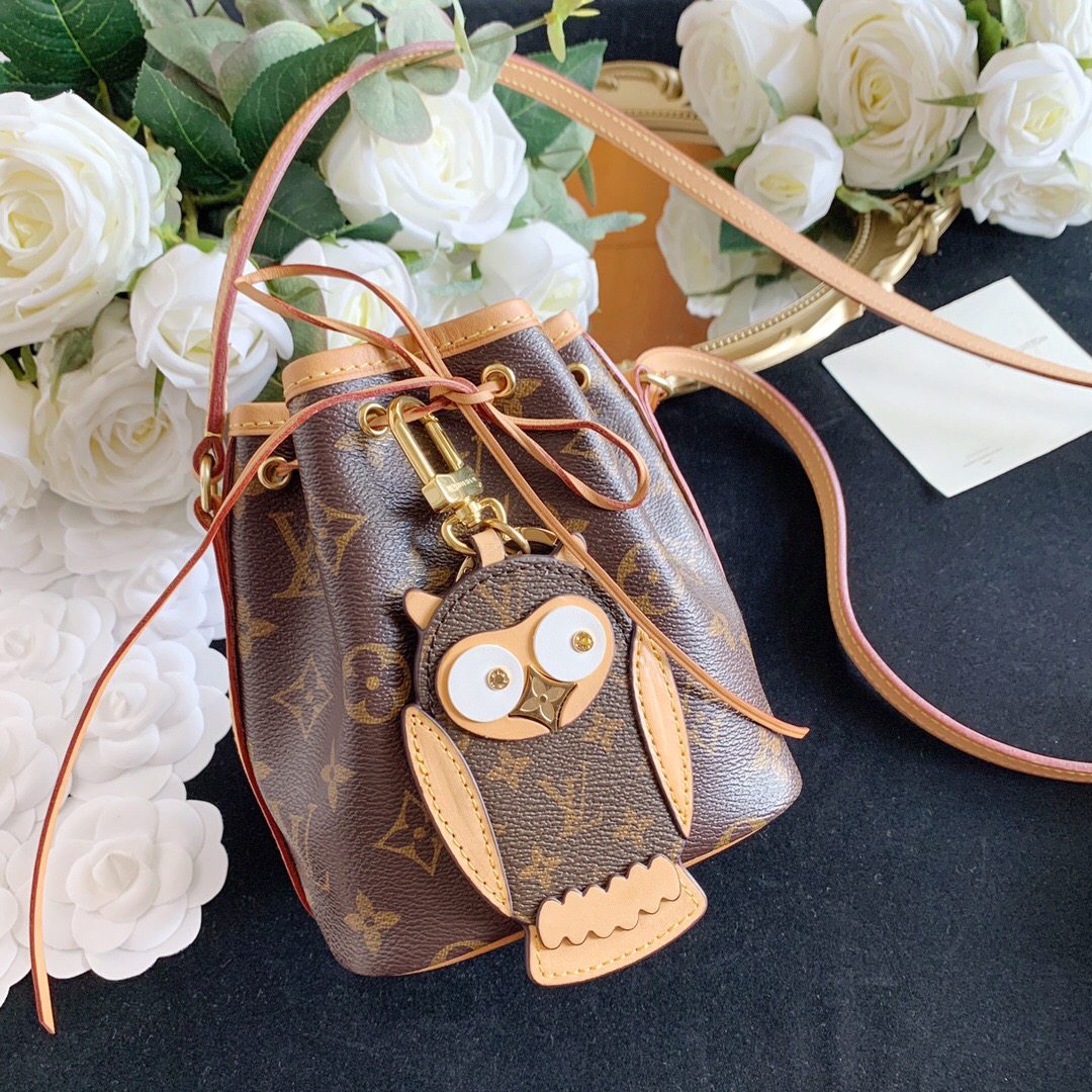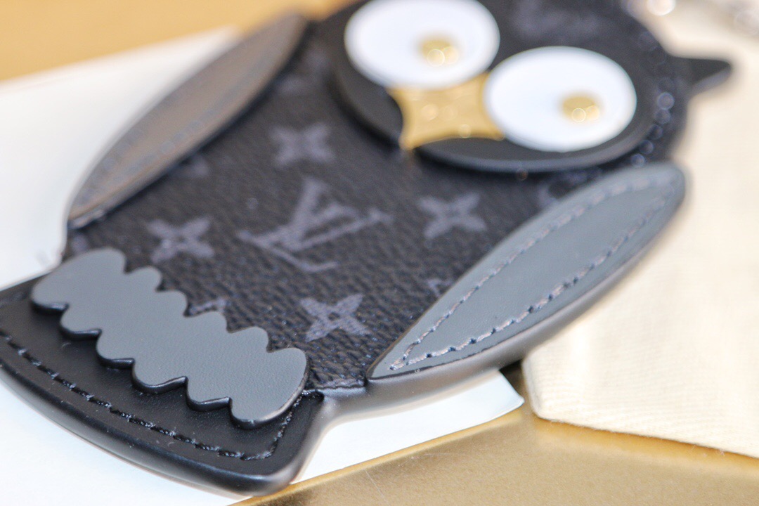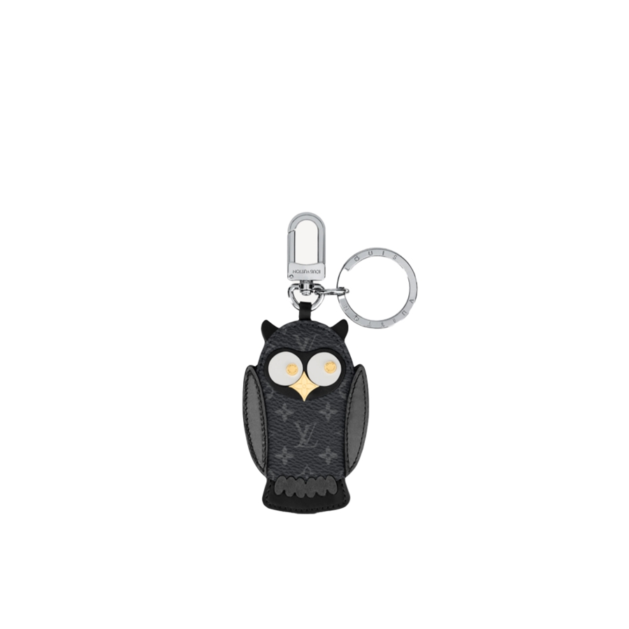 The Owl Bag Charm & Key Holder adds whimsical elegance to any accessory collection. Crafted from Monogram Eclipse canvas, it features LV stud eyes and gold hardware for a playful touch.