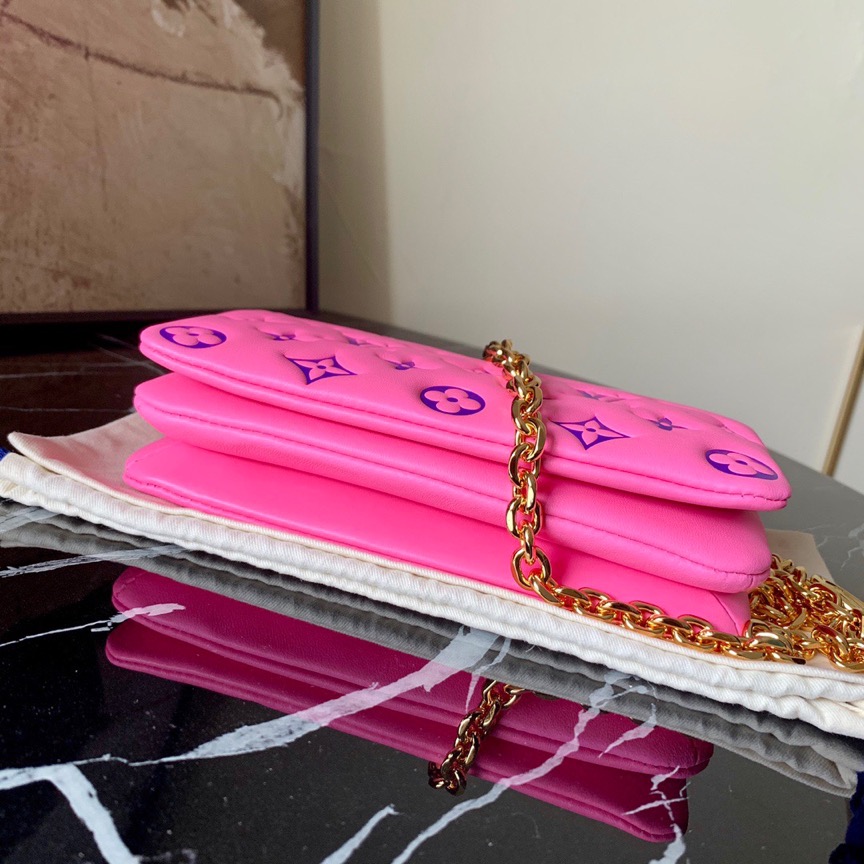 Introducing the exquisite Pochette Coussin, skillfully crafted from luxurious lambskin that boasts an embossed Monogram pattern, resulting in a delightful puffy and cushion-like texture. Adding to its allure is the thoughtfully constructed design, offering a supple and body-friendly shape. To cater to individual preferences, the removable chain, adorned with a charming Louis Vuitton emblem, allows for versatile carry options, be it as a chic clutch, effortlessly stylish shoulder bag, or even a trendy belt bag.