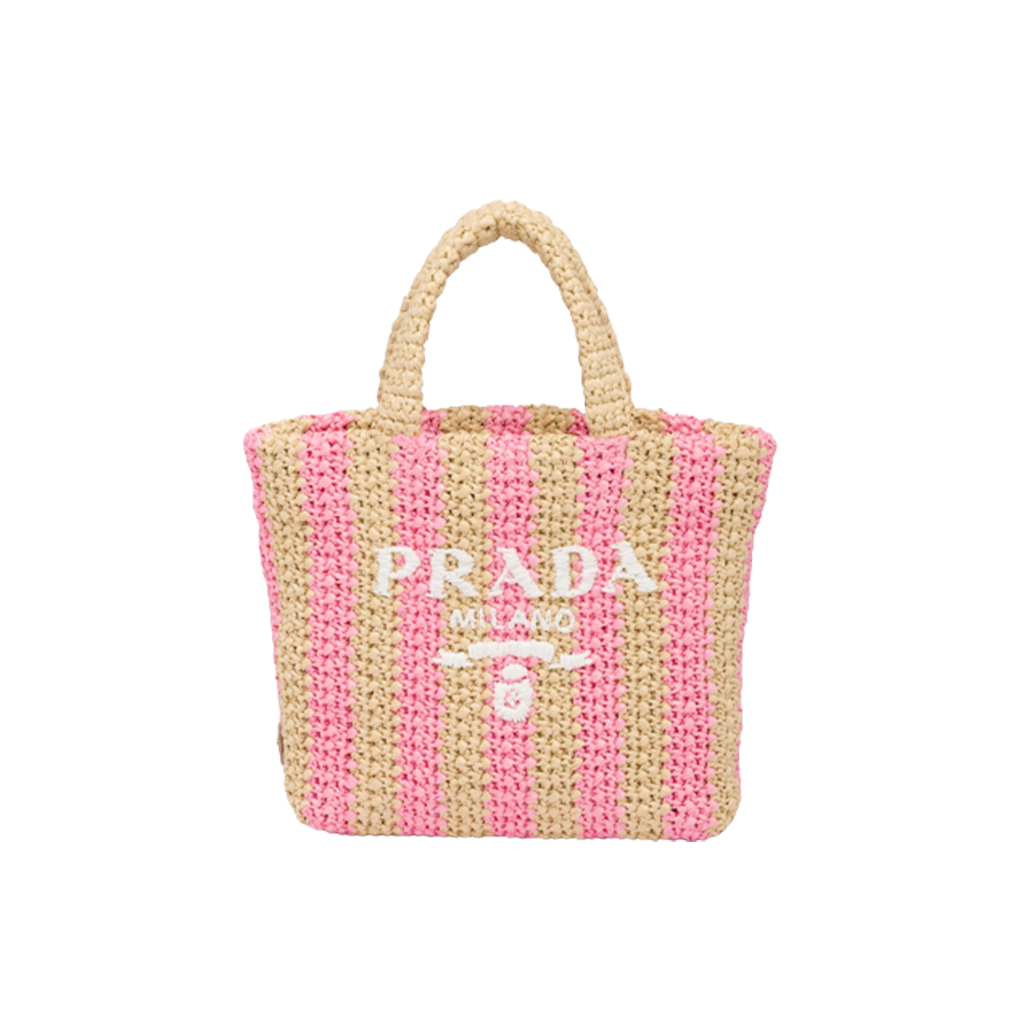 This Small Crochet Tote combines a deconstructed, raffia-inspired design with a breezy, summery vibe. Embroidered details and an enameled triangle add a signature touch, perfect for elevated casual style.