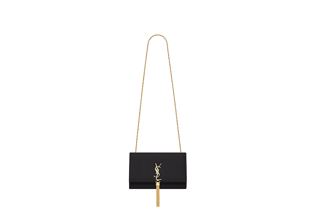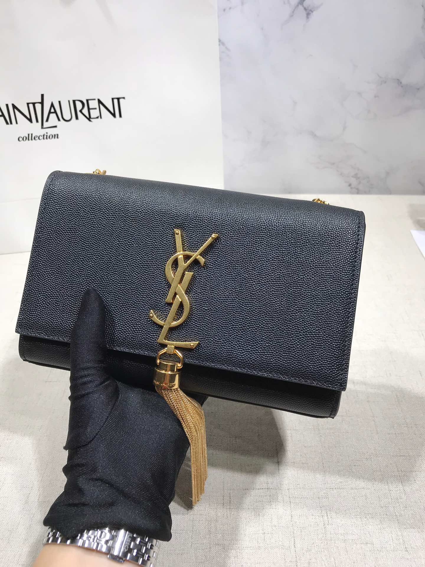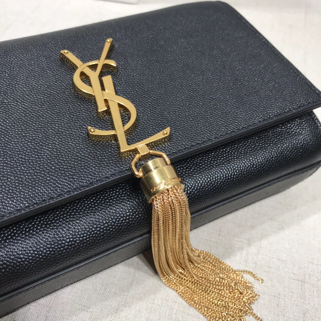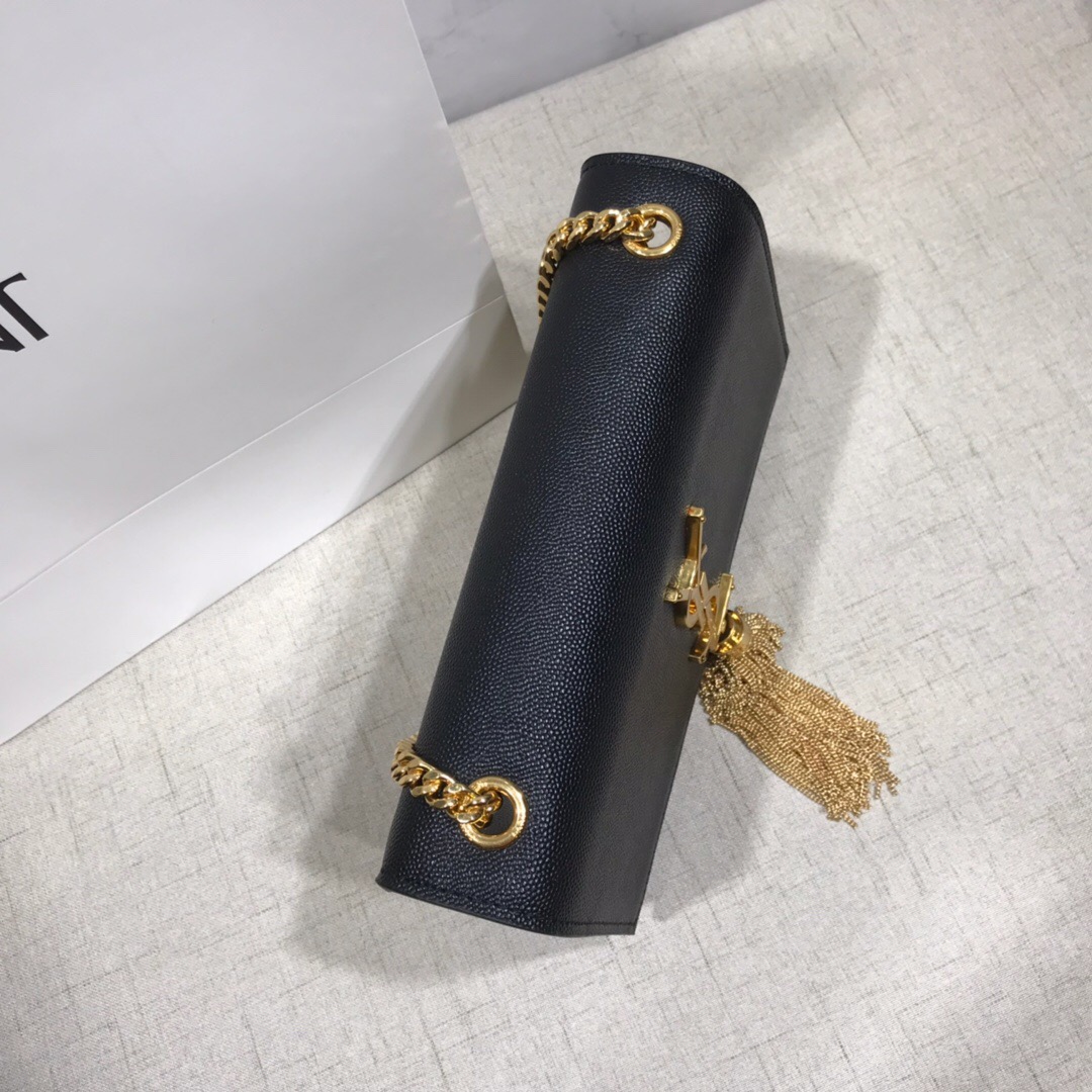 Elegantly designed, the Monogram ST *AURENT bag is embellished with a sleek curb chain, interlocking YSL initials in metal, and a shimmering metallic tassel. Meticulously crafted from supple leather, the Kate shoulder bag by Saint Laurent showcases a distinctive YSL monogram plaque and a dangling tassel detail on the front, adding an exquisite touch. This exquisite accessory is ideal for a night out, serving as the perfect go-to option. It features a chain shoulder strap, a secure foldover top with magnetic closure, a spacious main compartment, an internal slip pocket, a logo patch, a logo stamp, and exquisite metal hardware for a sophisticated finish.