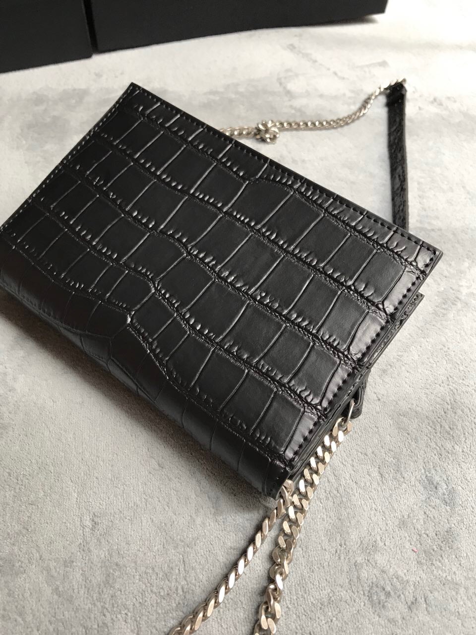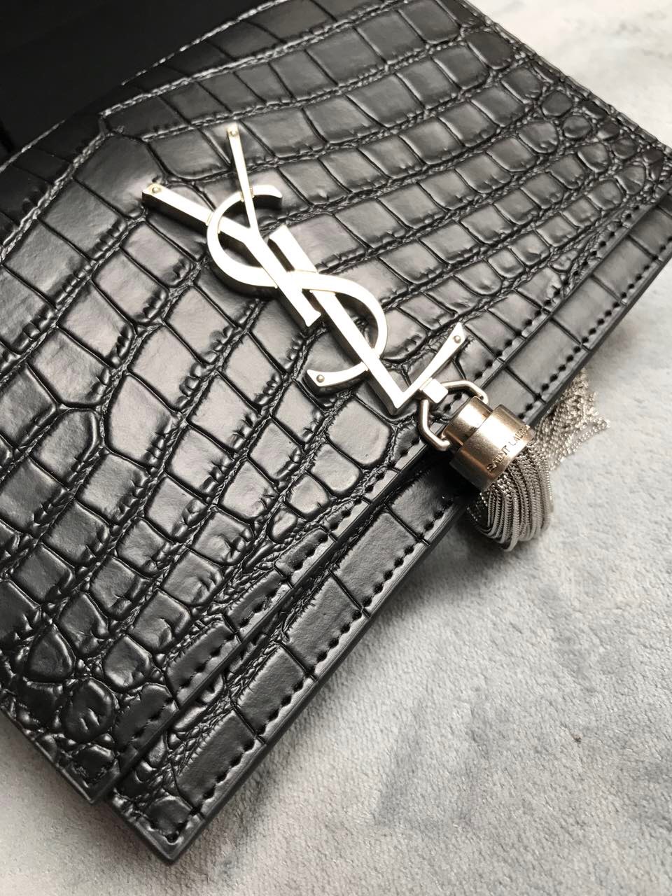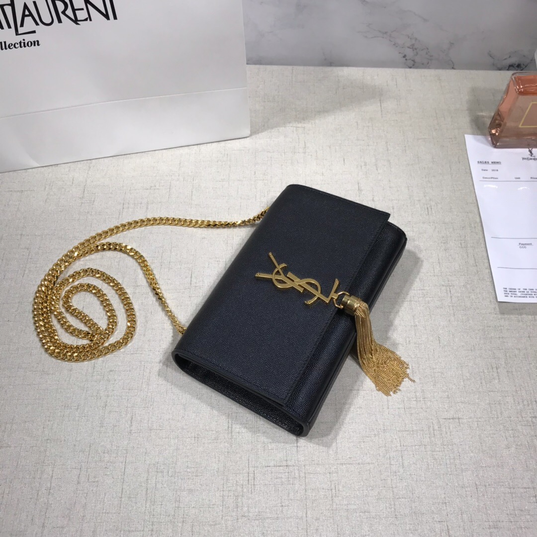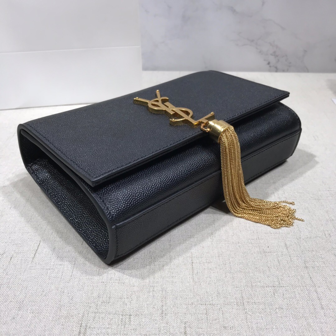 Elegantly designed, the Monogram ST *AURENT bag is embellished with a sleek curb chain, interlocking YSL initials in metal, and a shimmering metallic tassel. Meticulously crafted from supple leather, the Kate shoulder bag by Saint Laurent showcases a distinctive YSL monogram plaque and a dangling tassel detail on the front, adding an exquisite touch. This exquisite accessory is ideal for a night out, serving as the perfect go-to option. It features a chain shoulder strap, a secure foldover top with magnetic closure, a spacious main compartment, an internal slip pocket, a logo patch, a logo stamp, and exquisite metal hardware for a sophisticated finish.